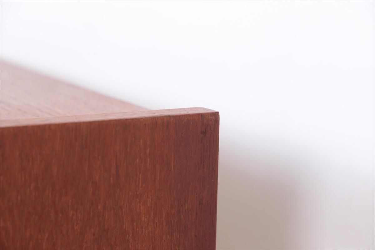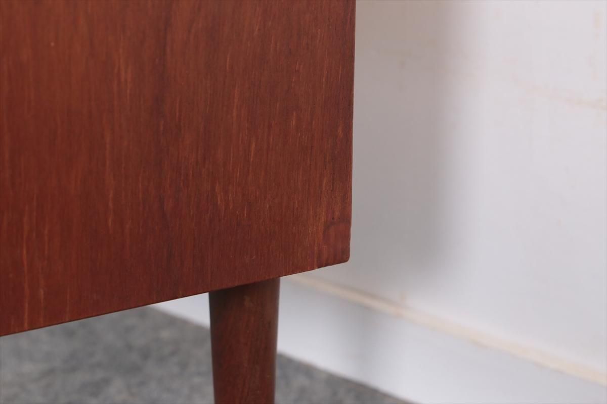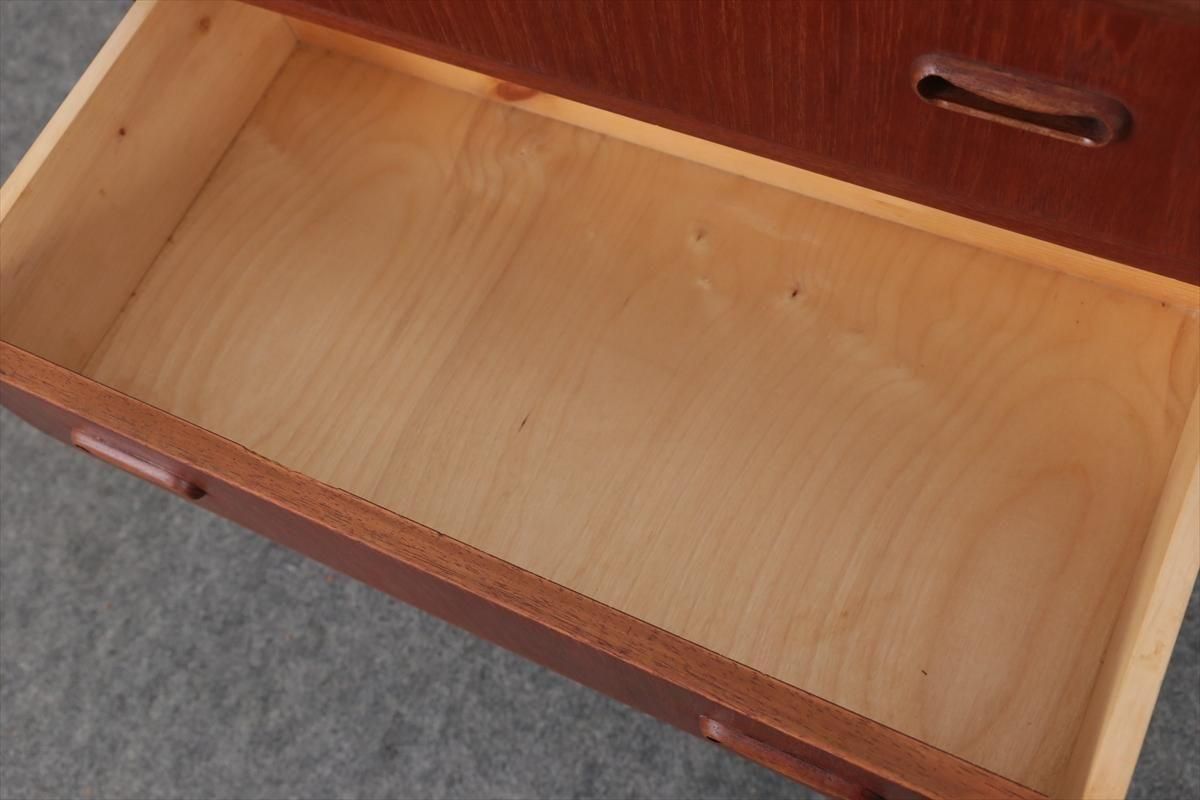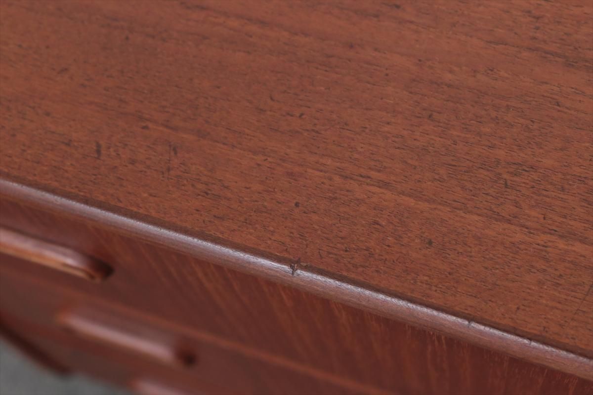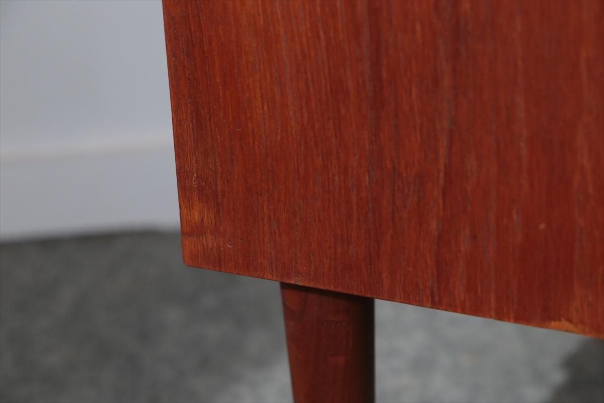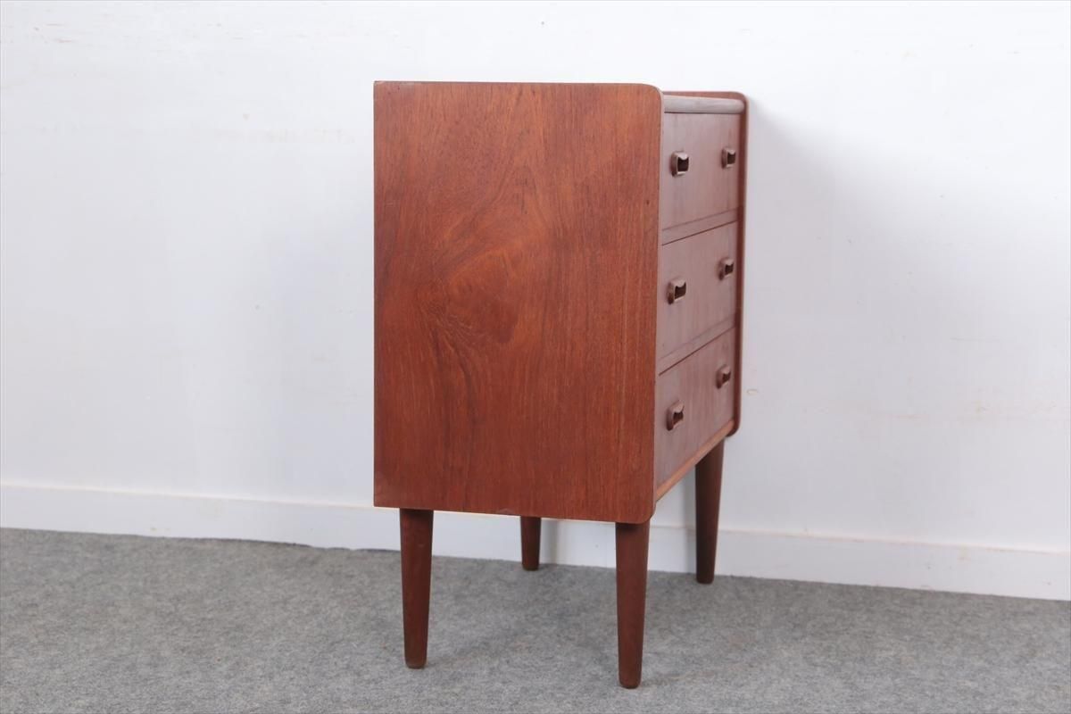デンマークのチークの3段ミニチェストです。とても人気のあるデザインで、持ち手が可愛らしい印象です。ベッドサイドや玄関や廊下などのスペースでも使えそうです。 お気に入りの物をディスプレイしながら、身の回りの小物などの収納が出来ます。置くだけでも空間の印象を変えてくれそうです。 持ち手に小さな欠けが所々あります。また、横面の角や引き出しに欠けを補修した跡があります。その他に角や引き出しの内側に小さな欠けや、細かいキズや凹みなど全体的に使用感はありますが、良いコンディションです。