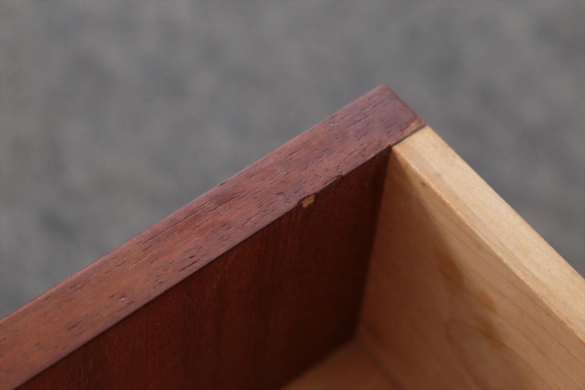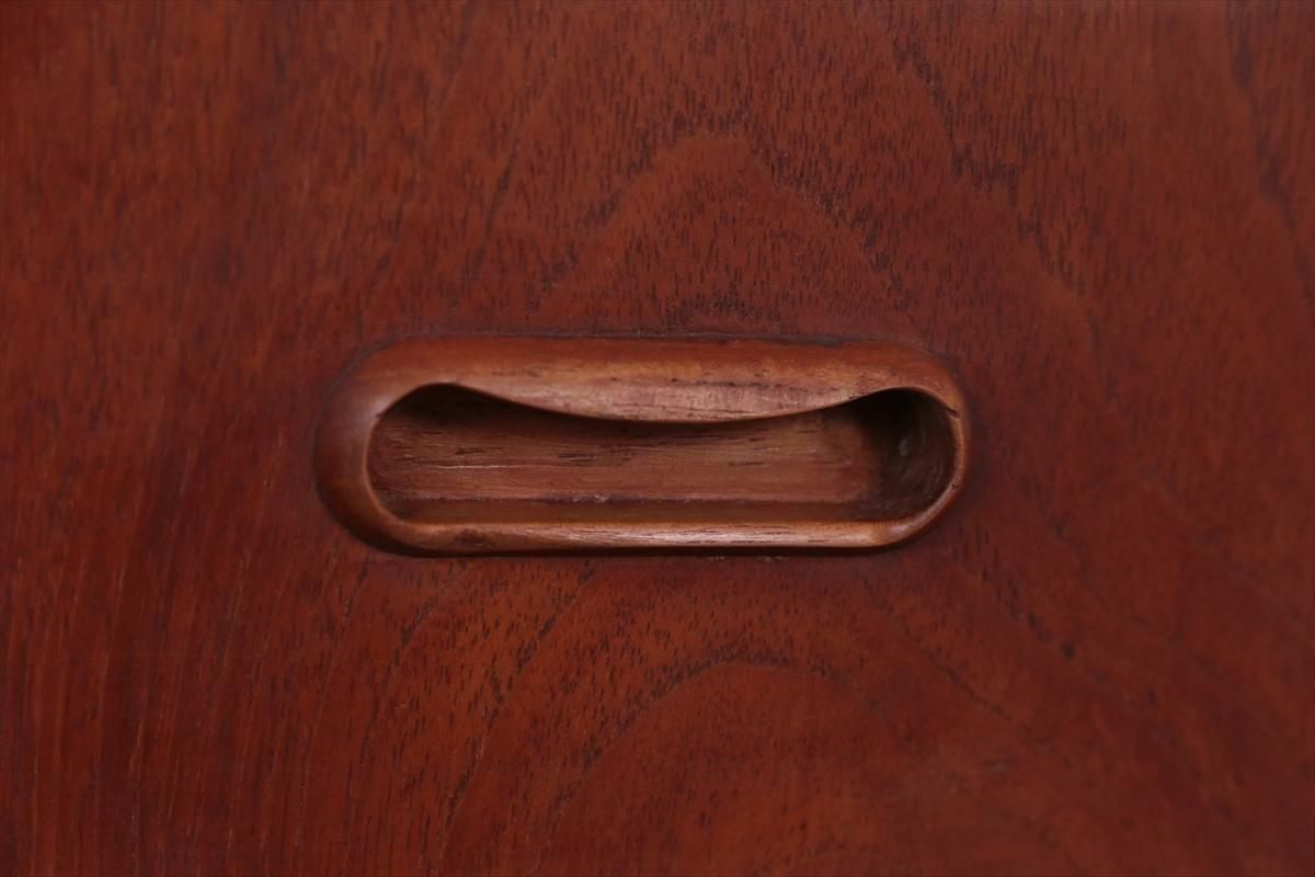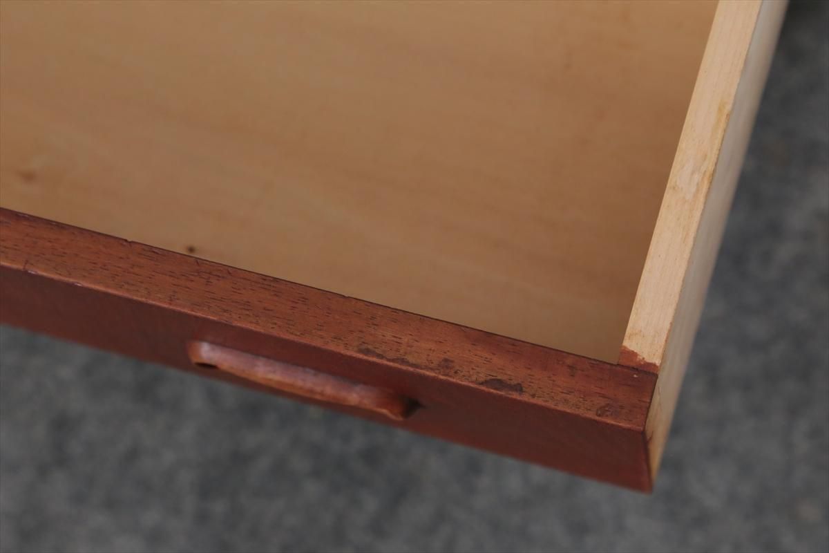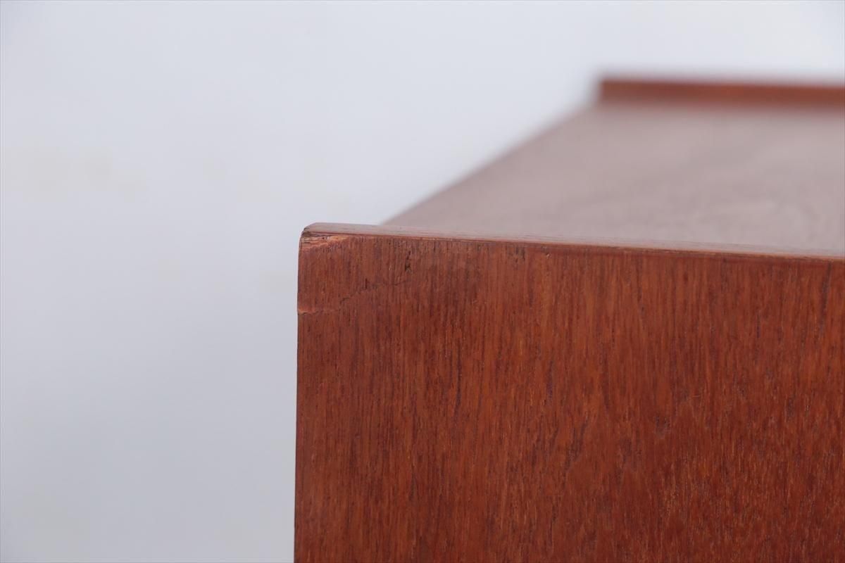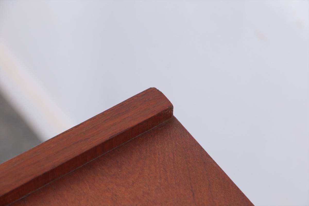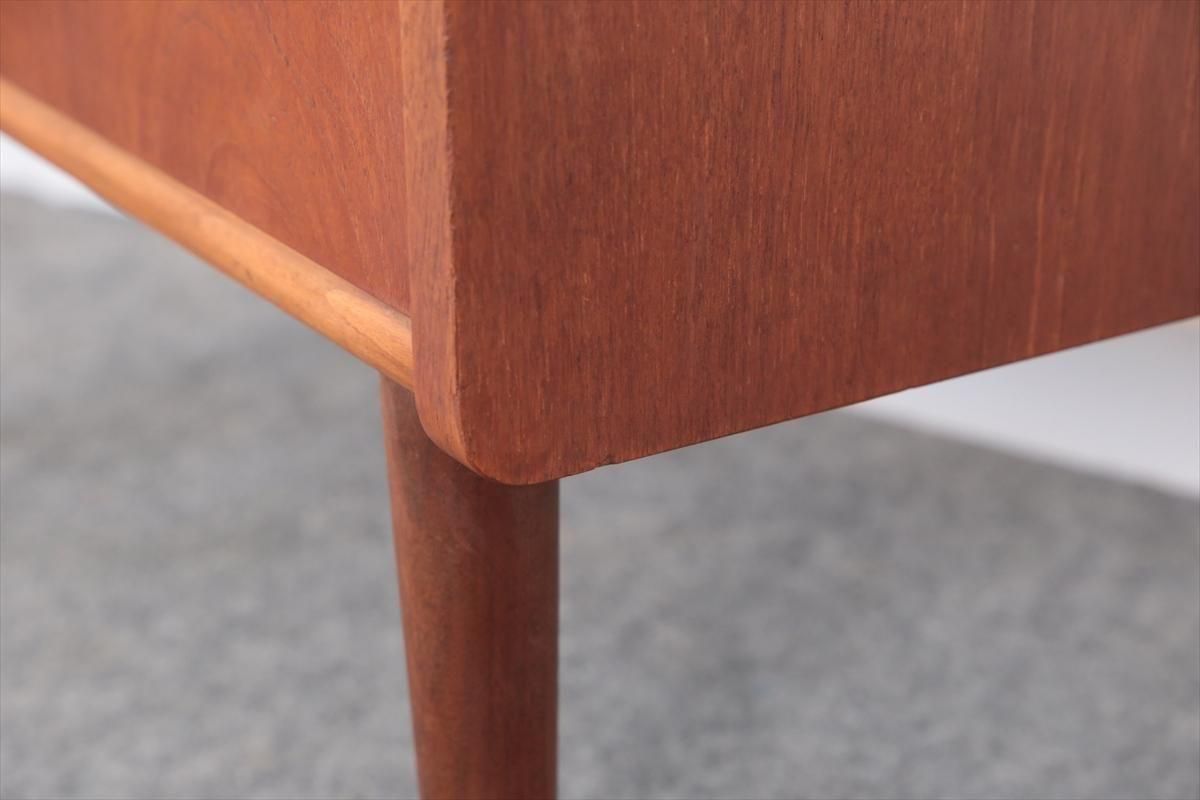 デンマークのチークの3段ミニチェストです。とても人気のあるデザインで、持ち手が可愛らしい印象です。ベッドサイドや玄関や廊下などのスペースでも使えそうです。 お気に入りの物をディスプレイしながら、身の回りの小物などの収納が出来ます。置くだけでも空間の印象を変えてくれそうです。 持ち手に小さな欠けが所々あります。また、横面の角や引き出しに欠けを補修した跡があります。その他に角や引き出しの内側に小さな欠けや、細かいキズや凹みなど全体的に使用感はありますが、良いコンディションです。