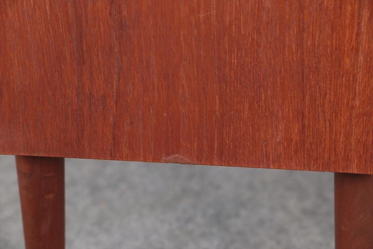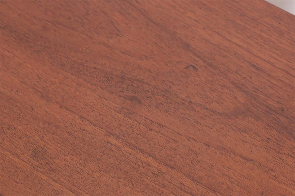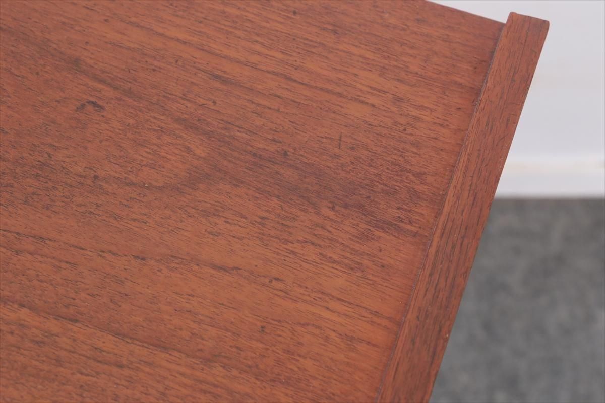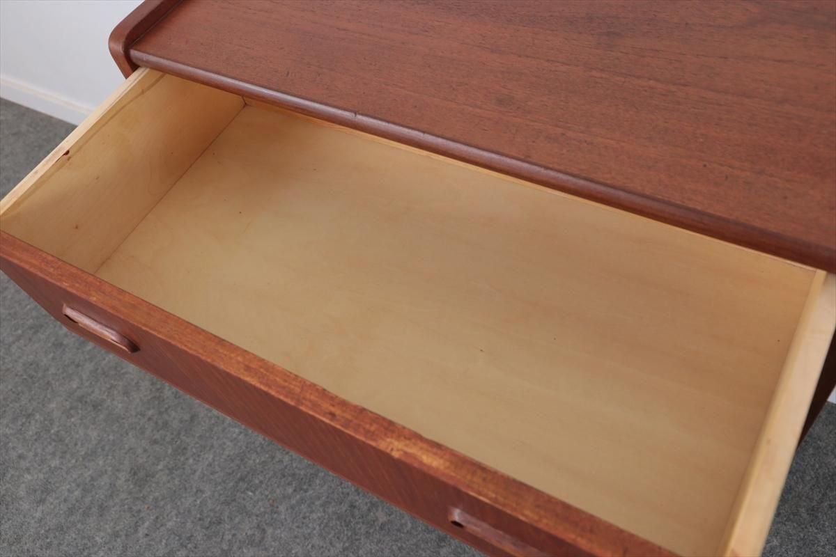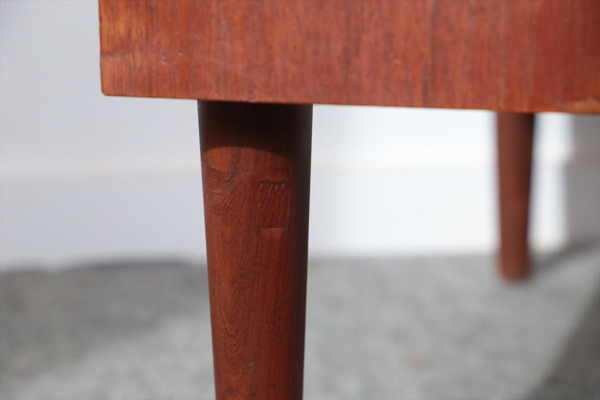 デンマークのチークの3段ミニチェストです。とても人気のあるデザインで、持ち手が可愛らしい印象です。ベッドサイドや玄関や廊下などのスペースでも使えそうです。 お気に入りの物をディスプレイしながら、身の回りの小物などの収納が出来ます。置くだけでも空間の印象を変えてくれそうです。 持ち手に小さな欠けが所々あります。また、横面の角や引き出しに欠けを補修した跡があります。その他に角や引き出しの内側に小さな欠けや、細かいキズや凹みなど全体的に使用感はありますが、良いコンディションです。