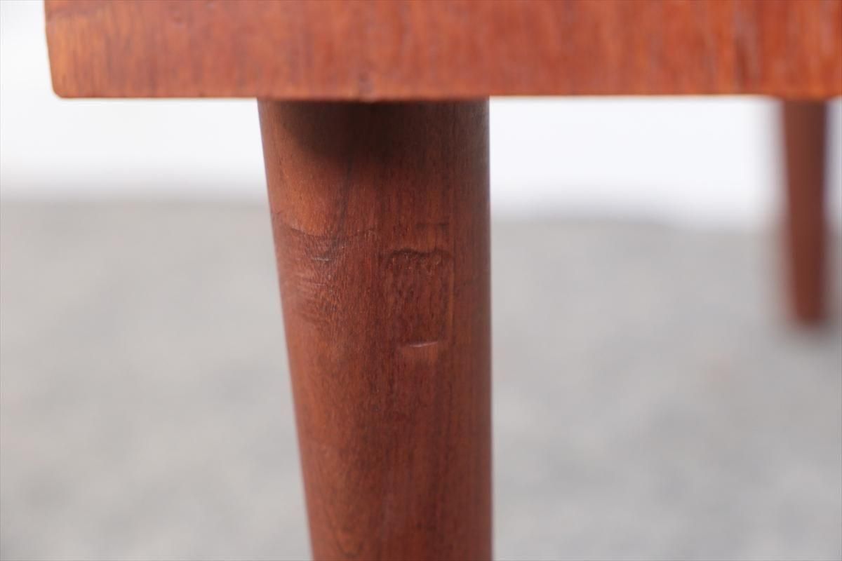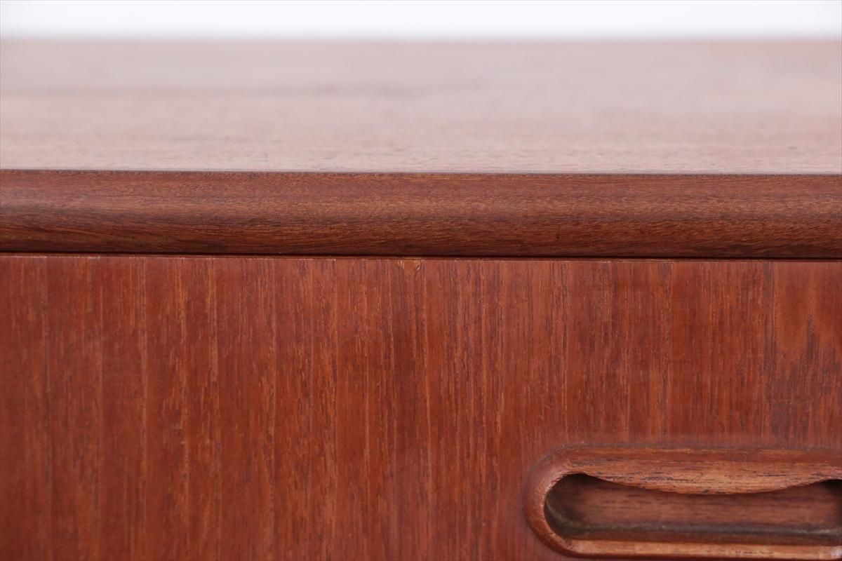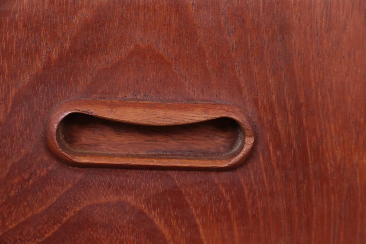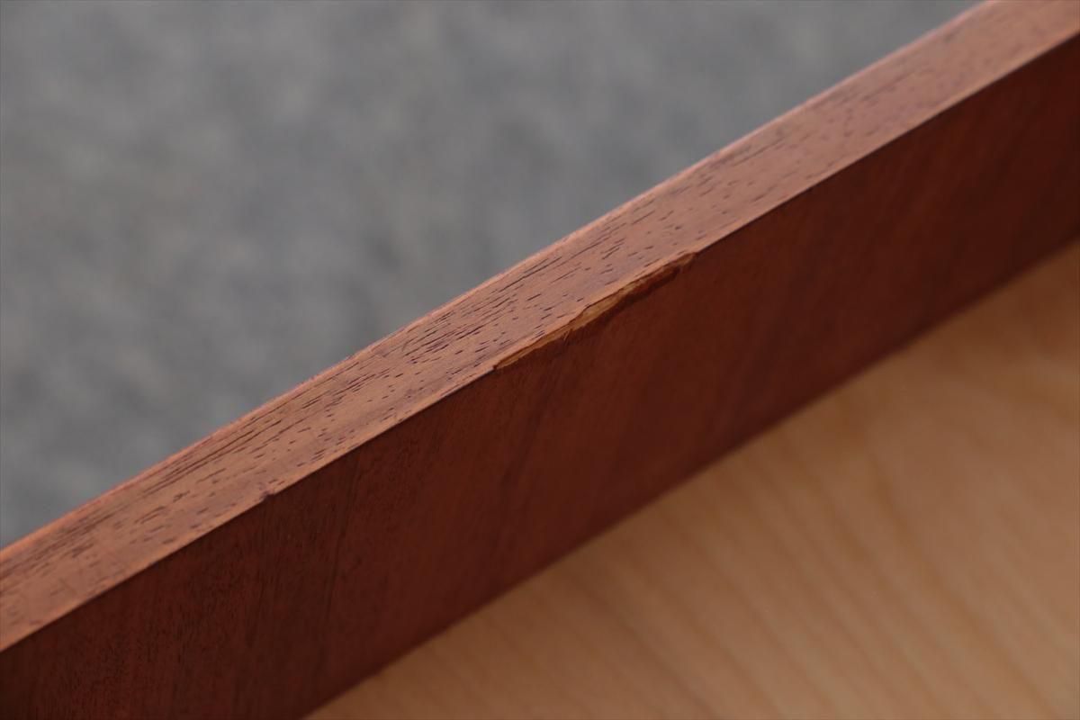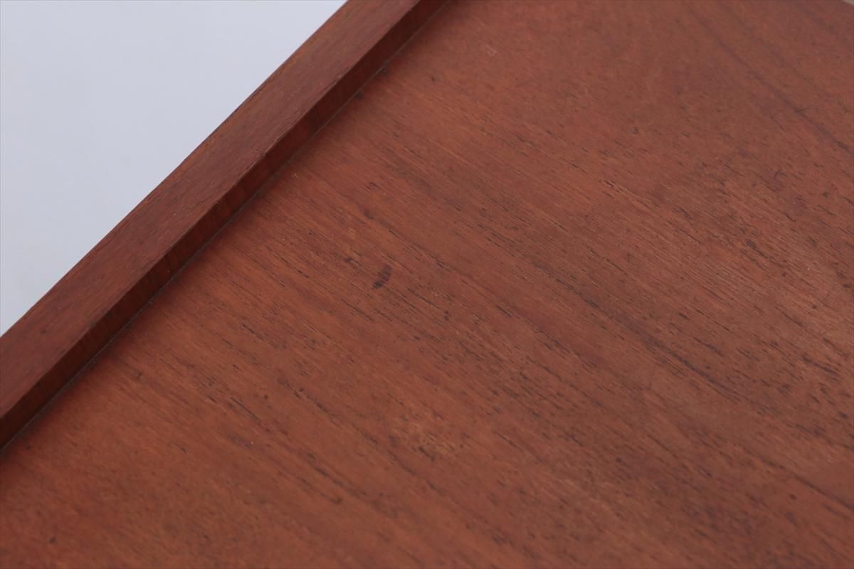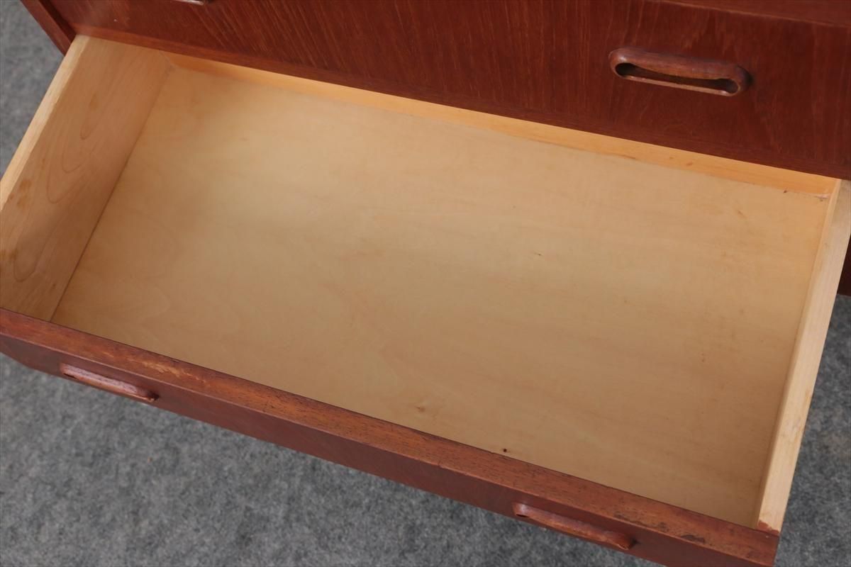 デンマークのチークの3段ミニチェストです。とても人気のあるデザインで、持ち手が可愛らしい印象です。ベッドサイドや玄関や廊下などのスペースでも使えそうです。 お気に入りの物をディスプレイしながら、身の回りの小物などの収納が出来ます。置くだけでも空間の印象を変えてくれそうです。 持ち手に小さな欠けが所々あります。また、横面の角や引き出しに欠けを補修した跡があります。その他に角や引き出しの内側に小さな欠けや、細かいキズや凹みなど全体的に使用感はありますが、良いコンディションです。