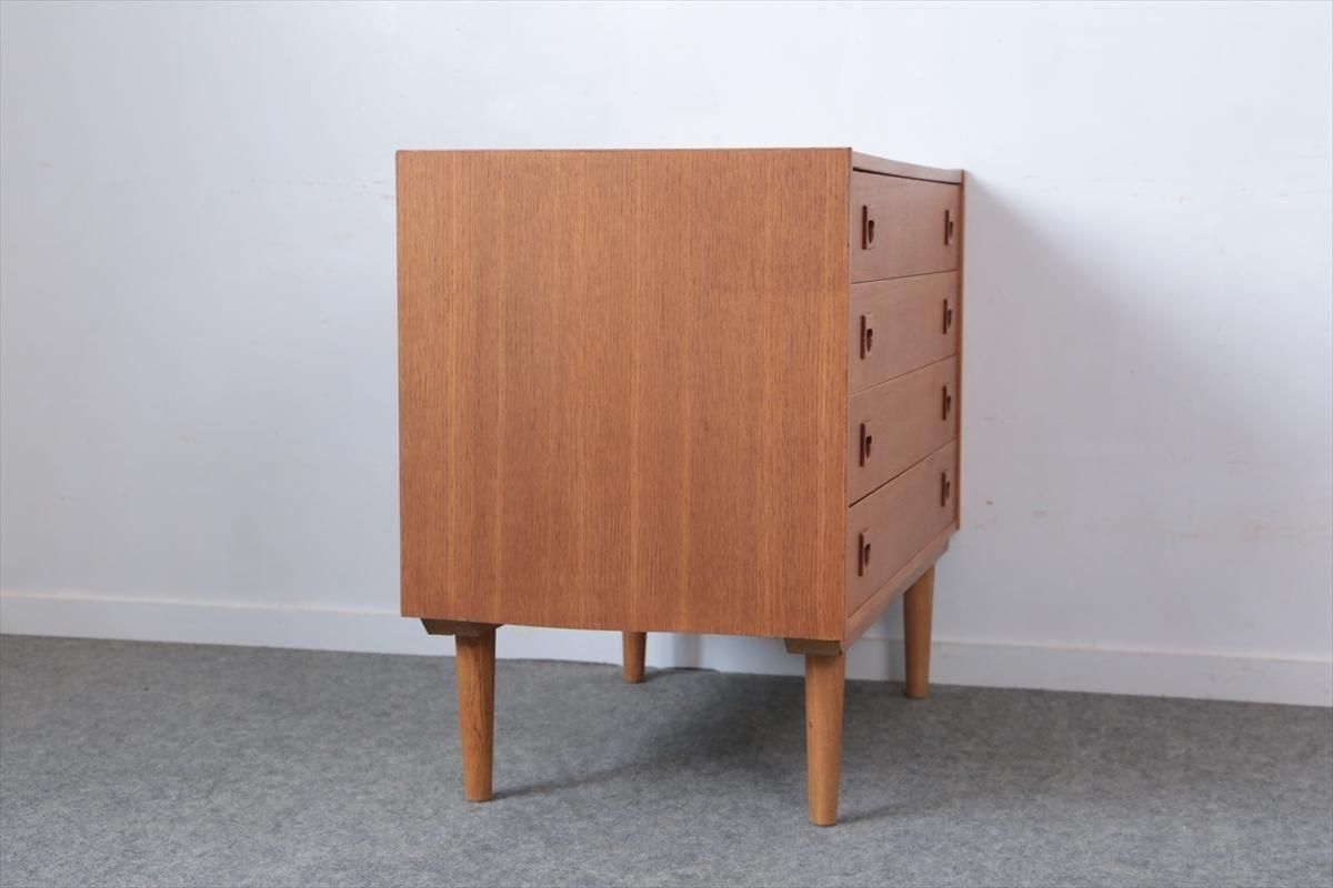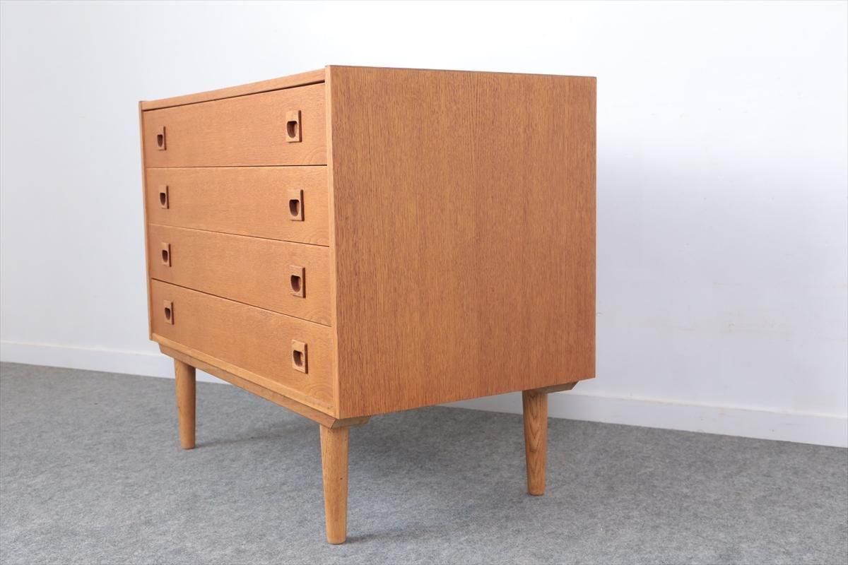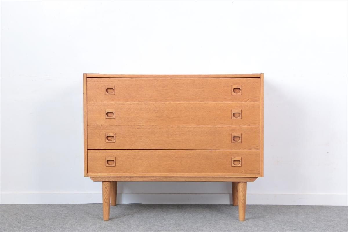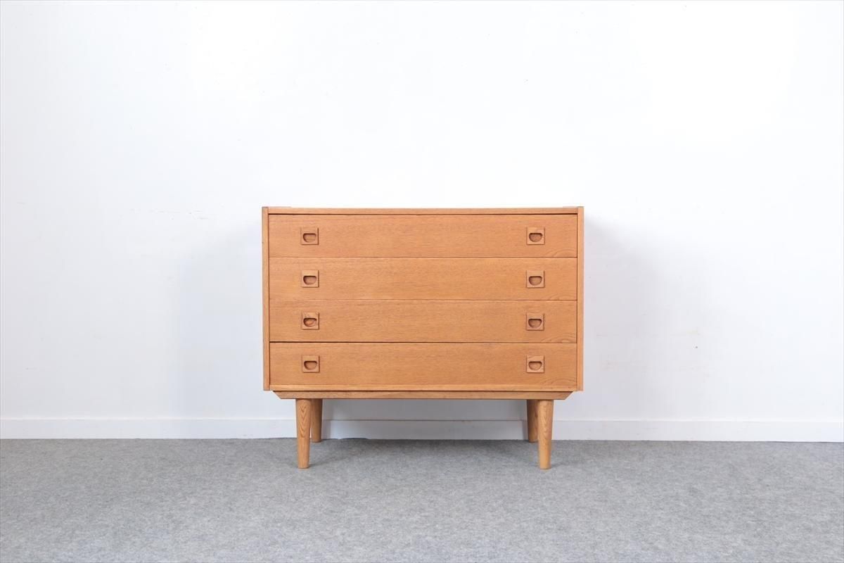 デンマークのオークの4段チェストです。 四角い持ち手がアクセントとなったシンプルなデザインです。幅88.8cm、奥行き49.5cmと大きいサイズで大変しっかりとした作りです。引き出しの深さも9cmあり、収納力がありそうです。 お気に入りのものをディスプレイしながら、衣類や身の回りの小物などをすっきり収納できそうです。 天板や縁に画像のような薄いキズや小さな凹みがあります。 その他にも細かいキズやわずかな色むらなど多少使用感はありますが、良いコンディションです。