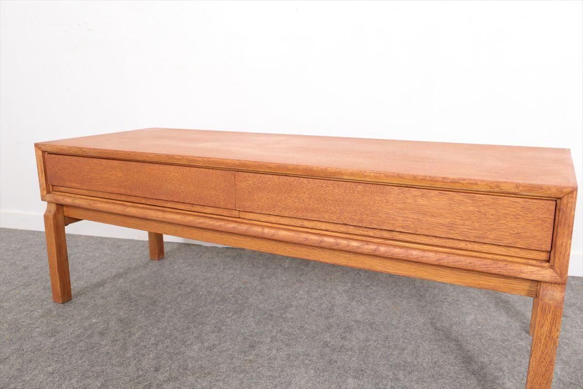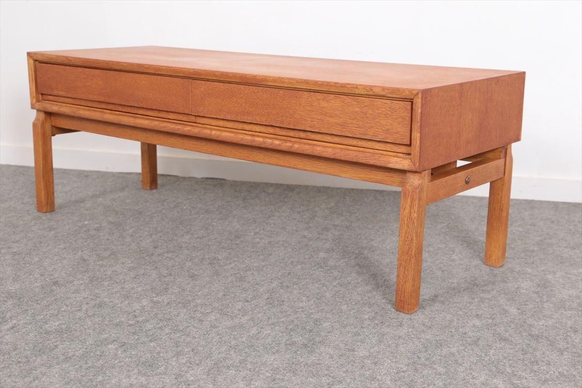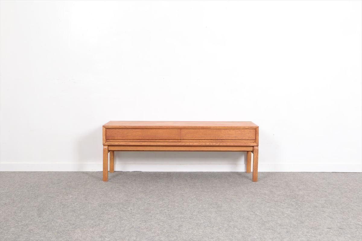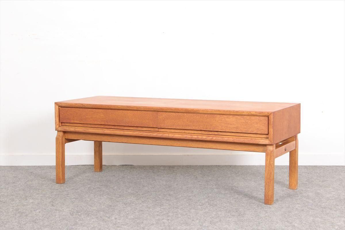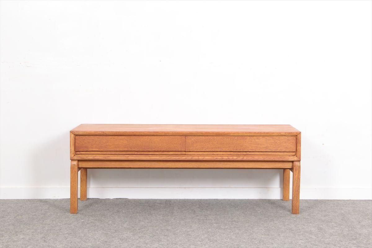 1962年にスウェーデンのIKEAで販売されていたオークのローチェストです。 こちらはポーランドのデザイナーMarianGrabinskiがデザインしたMTPシリーズの1つです。 MTPシリーズはチェストやキャビネット、本棚を自由に組み合わせることができた人気のシリーズでした。 2つ並んだ引き出しがデザインのアクセントとなったシンプルなデザインです。 引き出しの内部や全体の造りが良く、重厚さもあります。 テレビボードとしてもちょうど良い高さで、上にミラーや照明などを置いてディスプレイしても素敵です。背面もきれいな仕上げですので、コーヒーテーブルとしても使用できます。 経年のため、片側の脚がやや内側に向いていますが、がたつきがないように調整済みです。 その他にも小さなキズや色むらなど多少使用感がありますが、がたつきなどは無く、良いコンディションです。