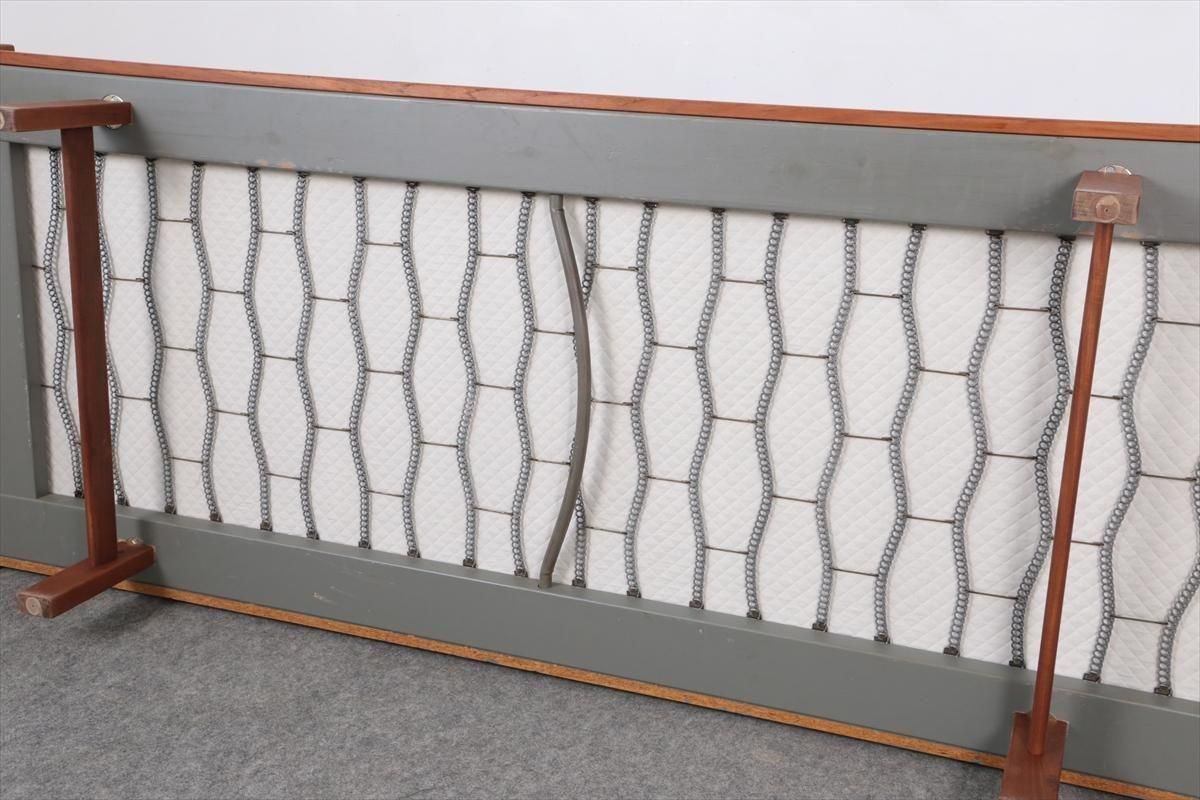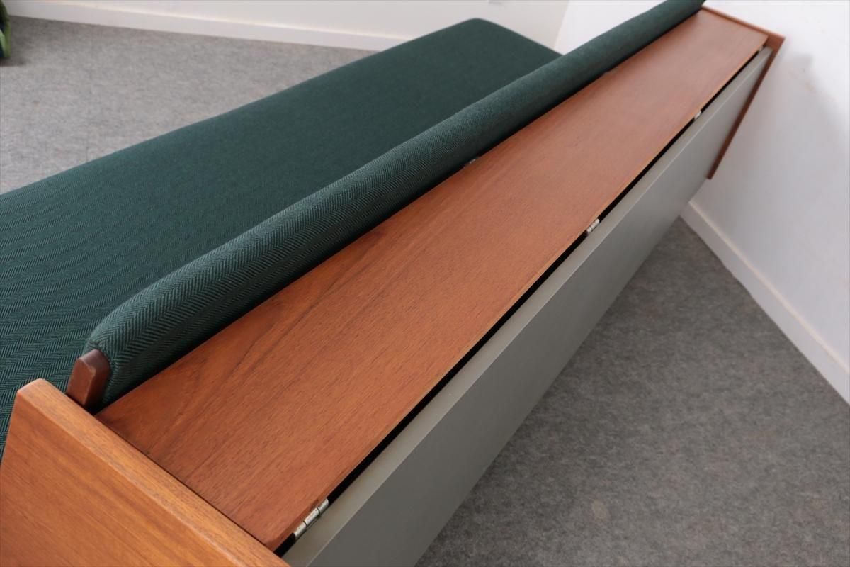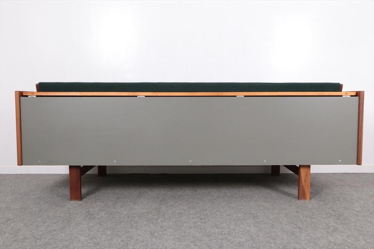 Hans J Wegner(ハンスJウェグナー)のデイベッド「GE258」です。 こちらはチークの角脚のタイプで、当時GETAMA社で製造されていたものです。 通常はソファとして、背もたれを上にスライドさせ持ち上げるとベッドとして使用できます。 来客用のベッドや、お昼寝などにもいいですね。ゆったりとくつろげます。 ソファ時には背もたれ内部に枕やブランケットなどを収納することも出来ます。 ファブリックはRIBACO(リバコ)のTRシリーズ/2015(素材:ウール30%、アクリル70%)で張替ています。 座面は取り外し可能なスプリング内包のタイプで弾力のある座り心地です。中のウレタンも新しいものに交換済みです。背面はグレーに塗装されているタイプです。 画像のような細かいキズや凹み、背板の欠けの補修など多少使用感はありますが、良いコンディションです。
