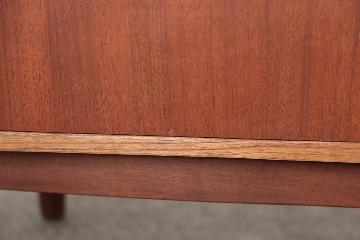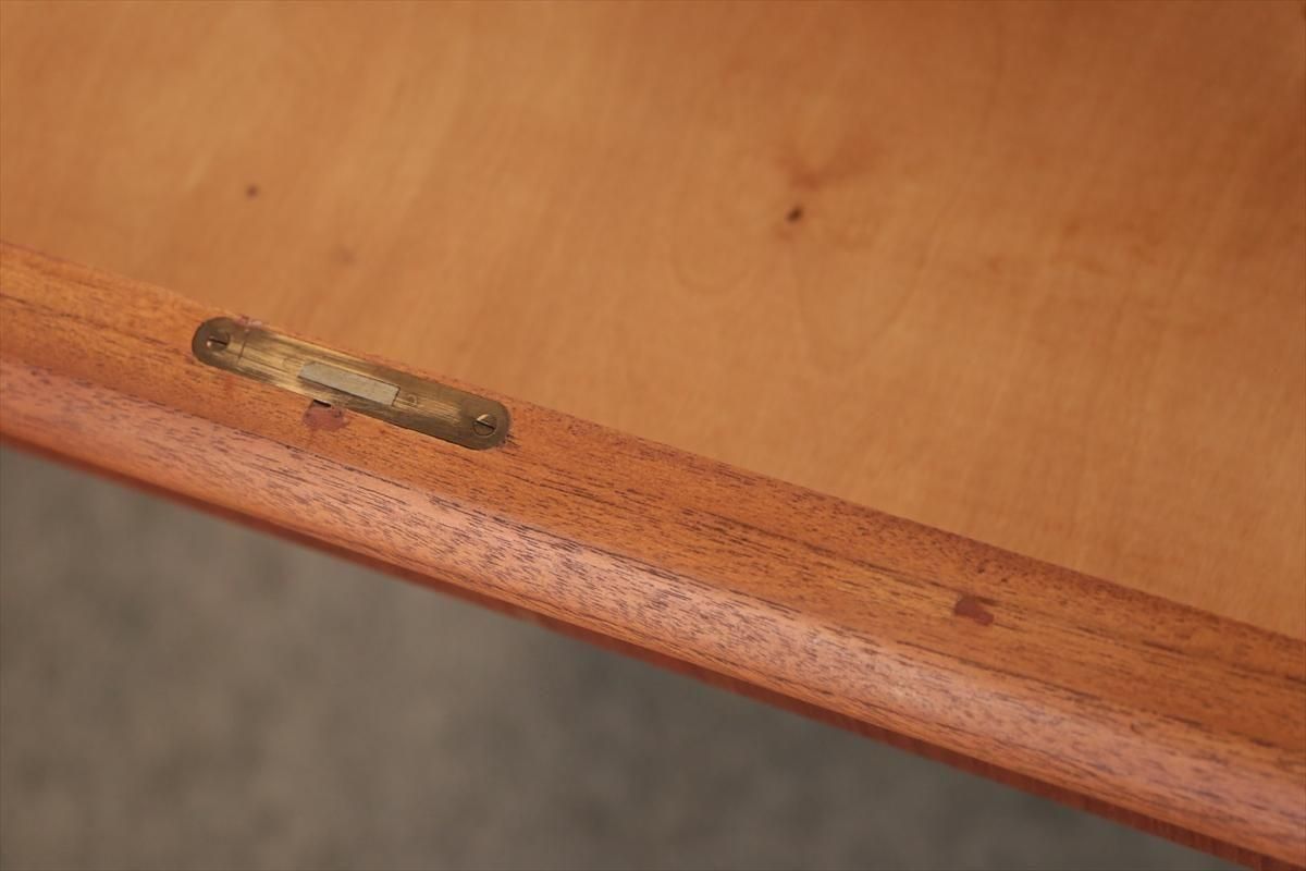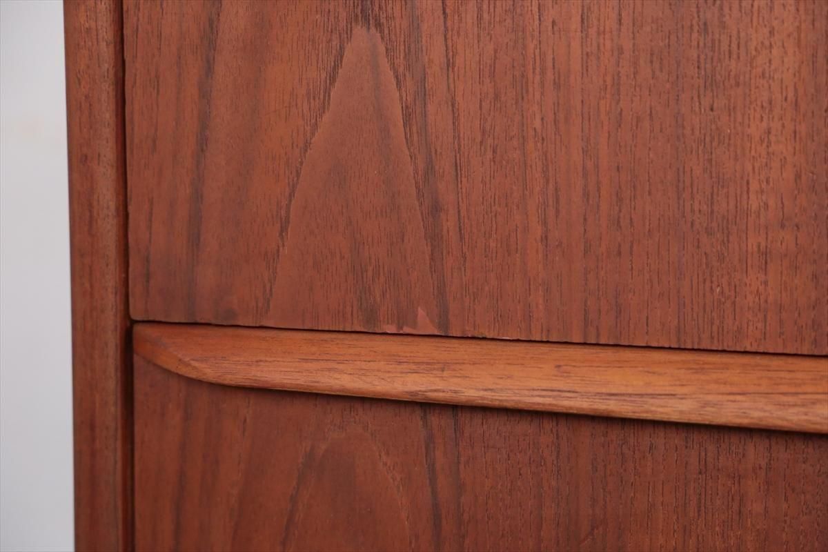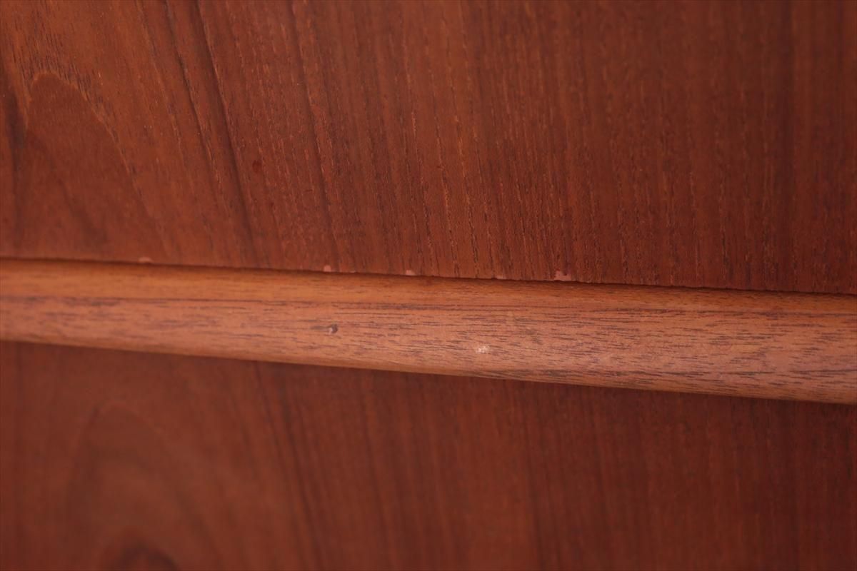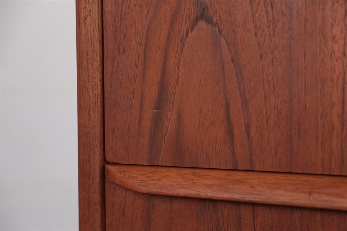 デンマークのチークの5段チェストです。 ストレートな持ち手がすっきりと見えるシンプルなデザインです。 天板の高さよりも横板が長いデザインも特徴的です。 持ち手はどこを持っても引き出しやすく、優しいチークの色がお部屋に馴染みやすいです。 お気に入りのものをディスプレイしながら、衣類や身の回りの小物などをすっきりと収納できます。 画像のように、突板の欠けを補修した箇所や接着箇所が数か所あります。 また、天板と背板の隙間に接着跡が見られますが、強度やご使用に問題のないようメンテナンスしております。 その他の細かいキズやわずかな欠けなど全体的に多少使用感はありますが、良いコンディションです。