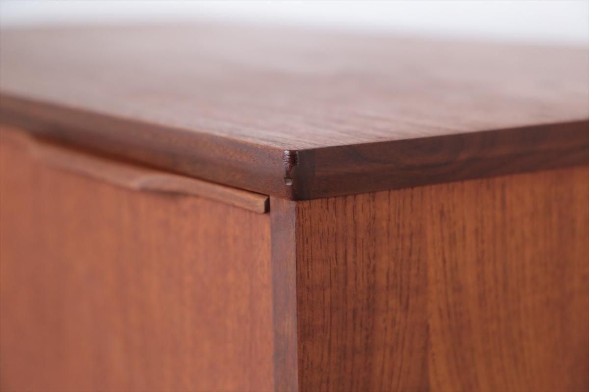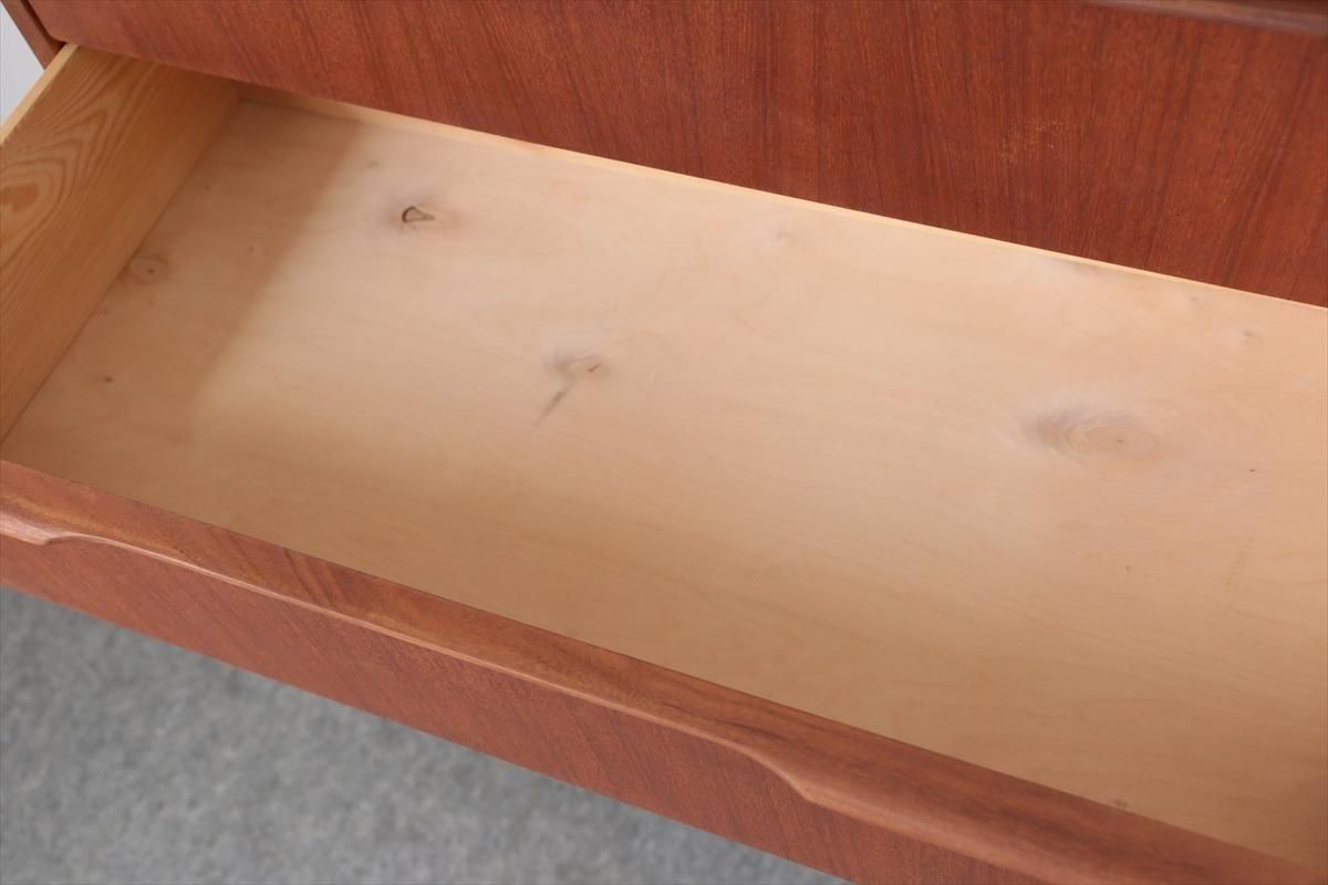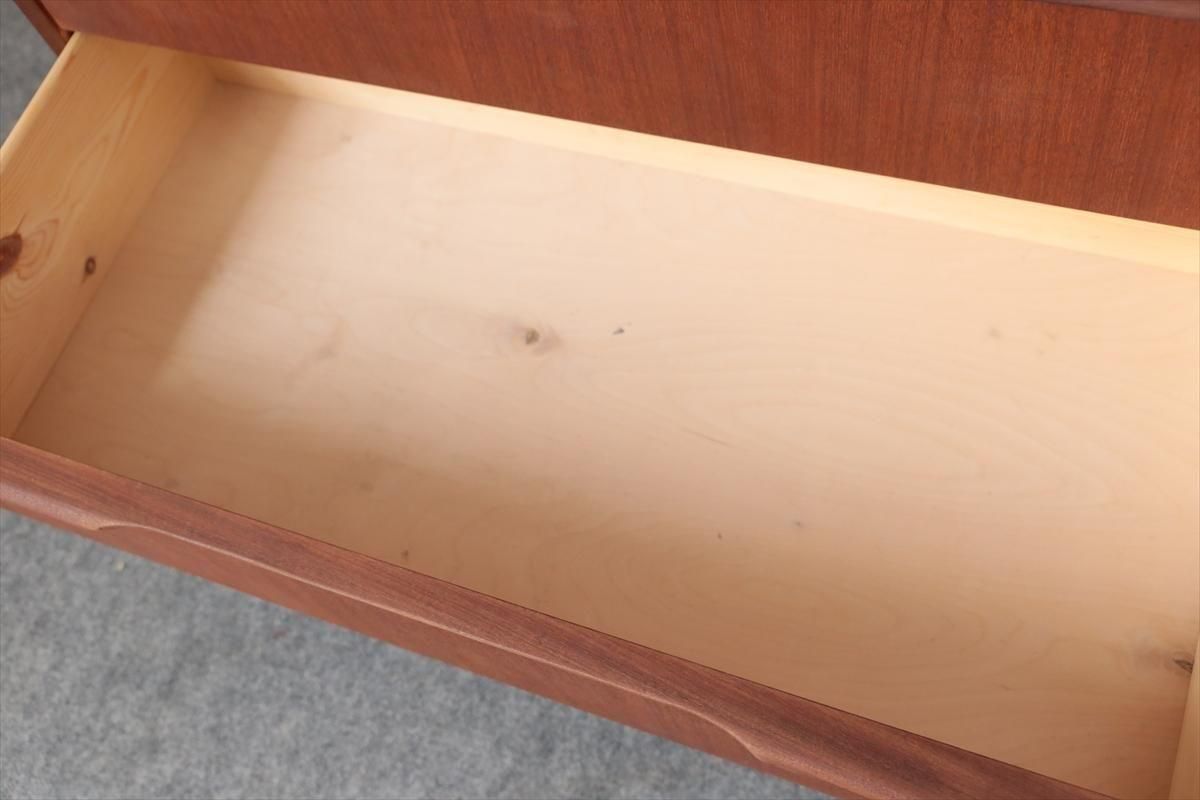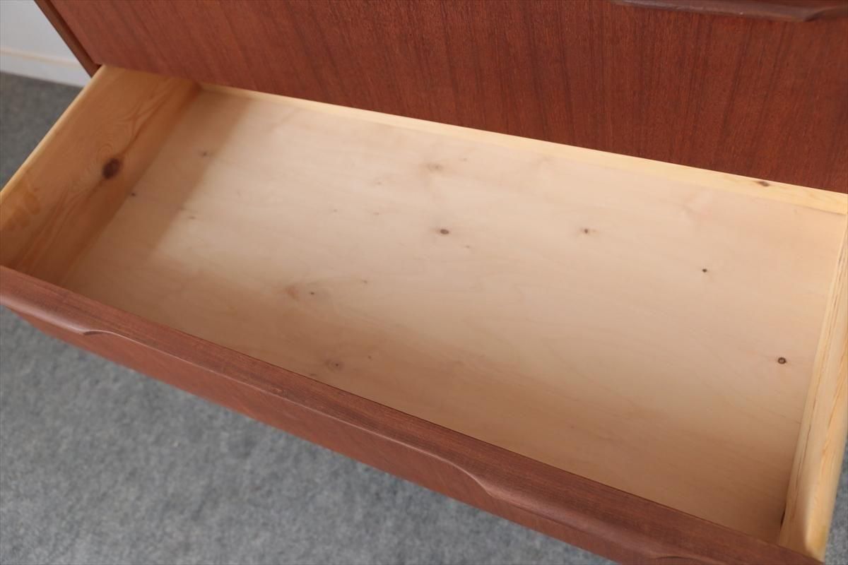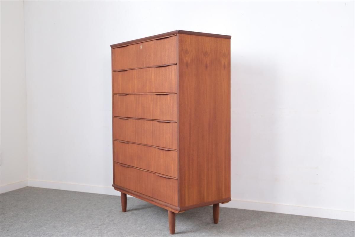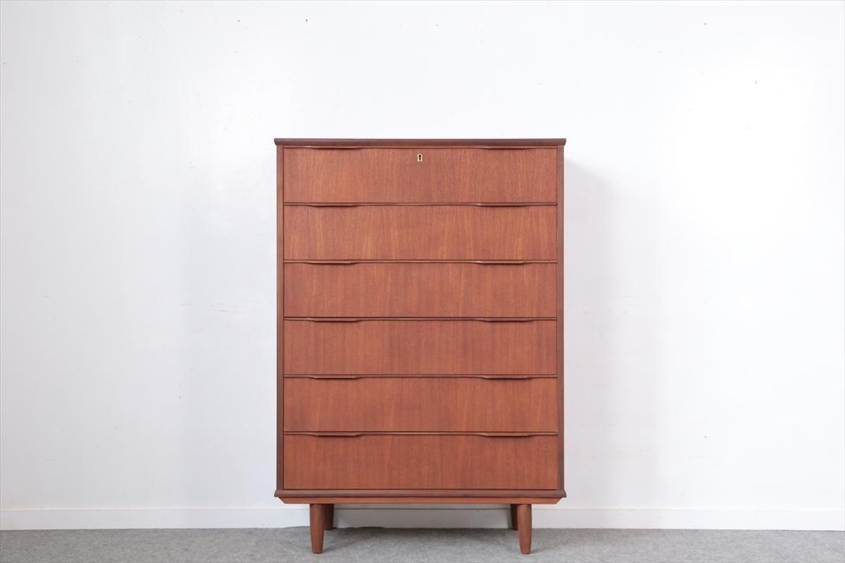 デンマークのチークの6段チェストです。 デンマーク家具らしい持ち手のデザインがアクセントとなった シンプルで温かみのあるデザインです。収納力のあるとてもしっかりとした造りです。 お気に入りのものをディスプレイしながら、衣類や身の回りの小物などをすっきりと収納できます。 天板の角や横板に小さな凹みキズがあります。 その他の細かいキズなど多少使用感はありますが、良いコンディションです。