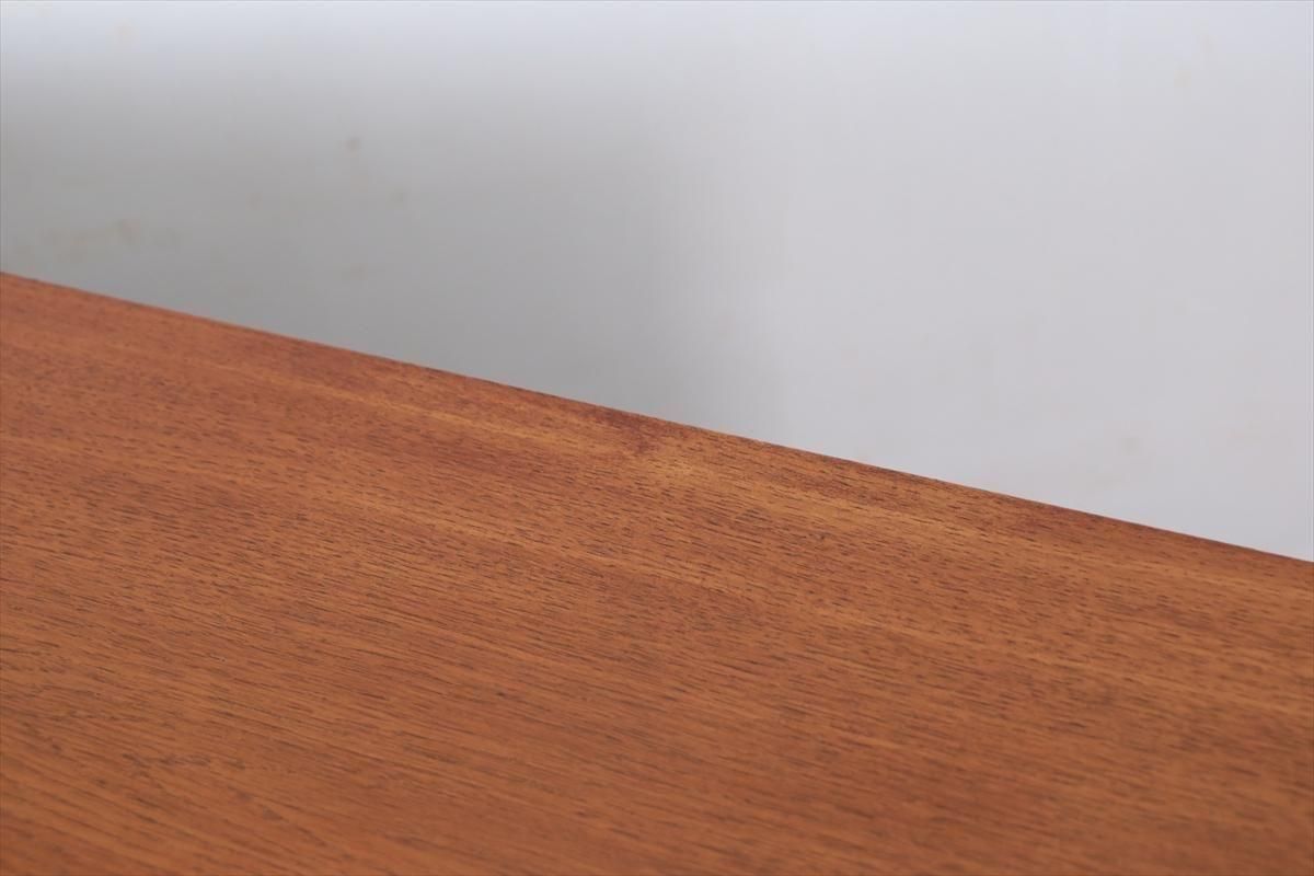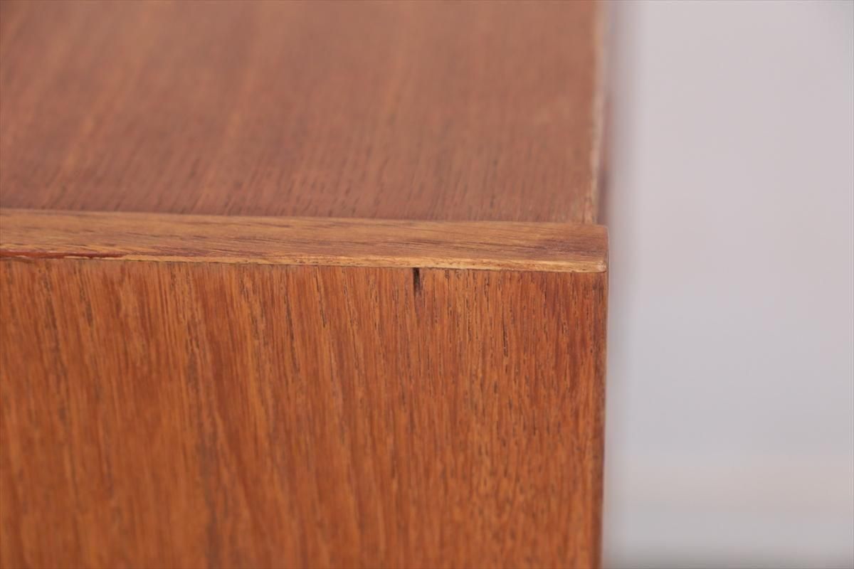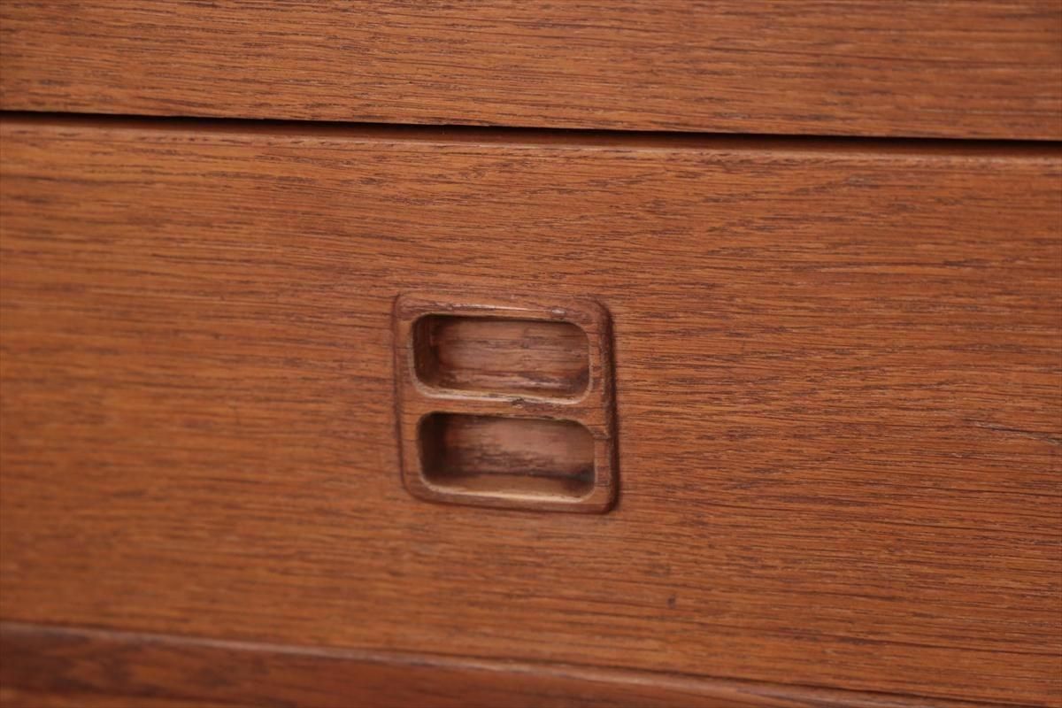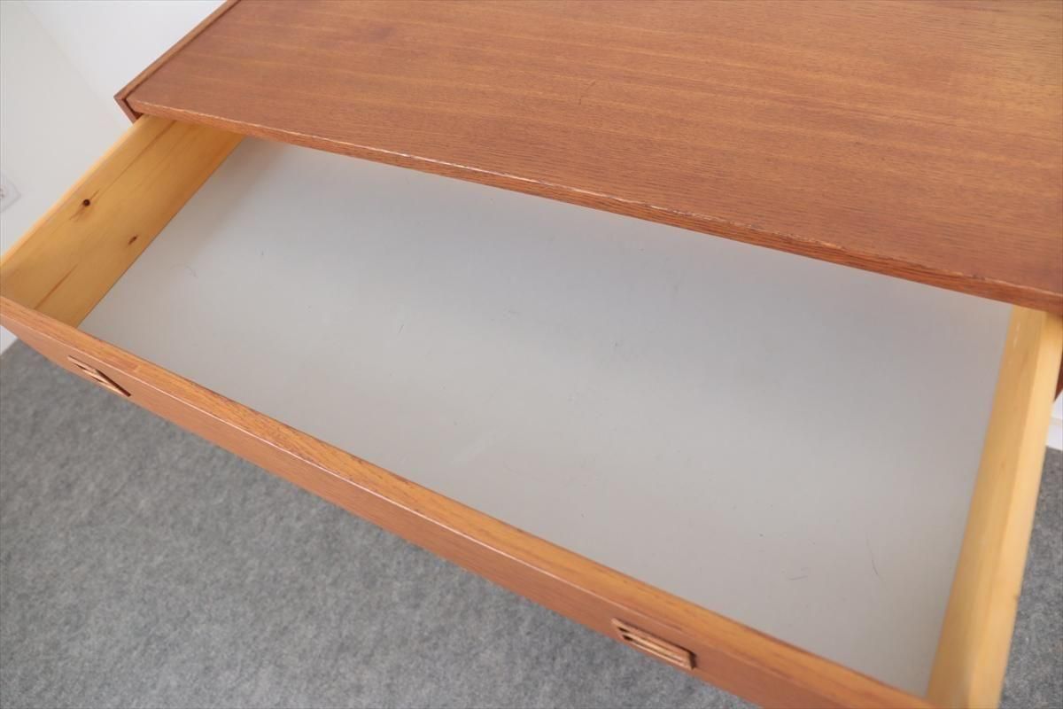 デンマークのオークの4段チェストです。 四角い持ち手がアクセントとなったデンマークらしいデザインです。高さが76cmとやや低めの為 お気に入りのものをディスプレイしながら、衣類や身の回りの小物などをすっきり収納できそうです。 天板や縁に画像のようた小さなキズや凹みがあります。また、引き出しの底板にわずかなひび割れがありますが、強度には問題が無い程度です。 その他にもわずかな色むらなど多少使用感はありますが、良いコンディションです。