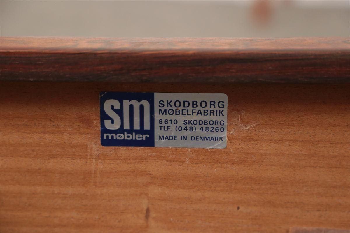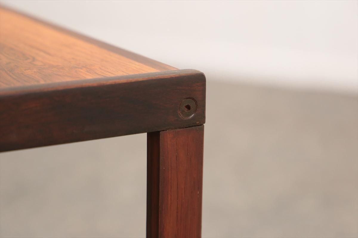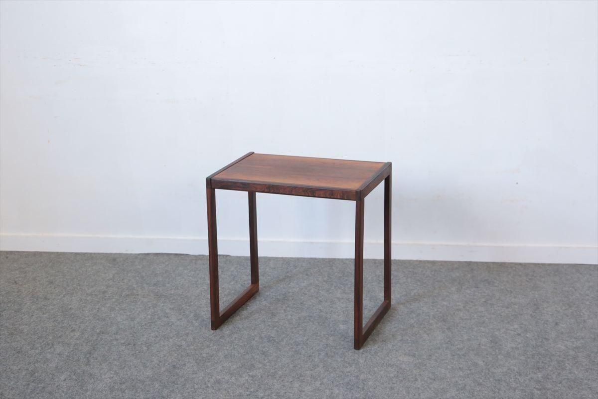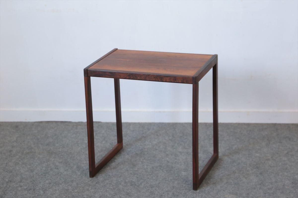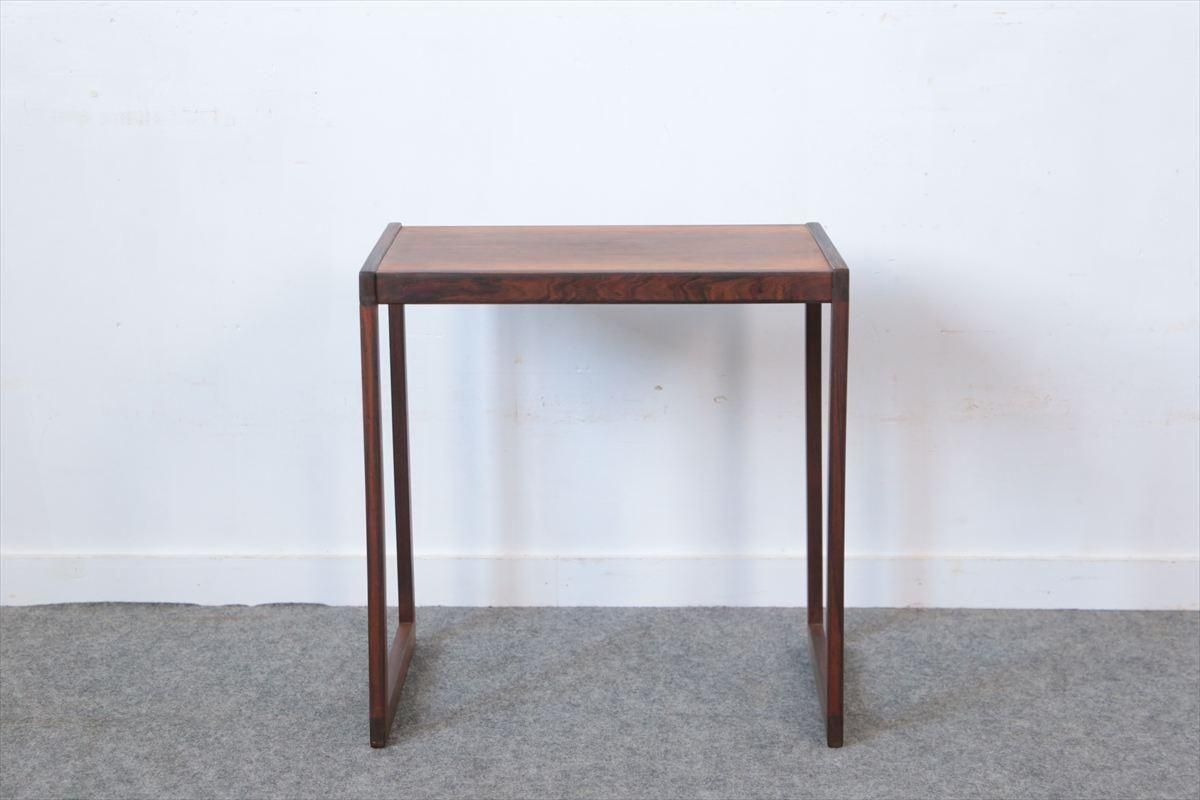 デンマークSKODBORG社製のローズウッドのサイドテーブルです。 脚のデザインがアクセントとなったシンプルなフォルムです。 本来はネストテーブルのうちの一台だったようです。 ベッドサイドや玄関先、ちょっとしたスペースにアクセントとして置いてみるのも素敵です。 縁に画像のようなキズや、脚の接合部にわずかな隙間がありますが、強度やご使用には問題のない程度です。 多少使用感はありますが、全体的には良いコンディションです。