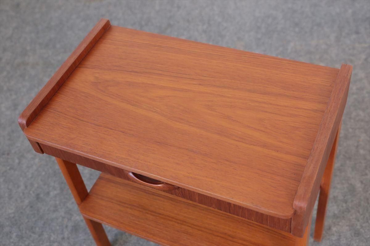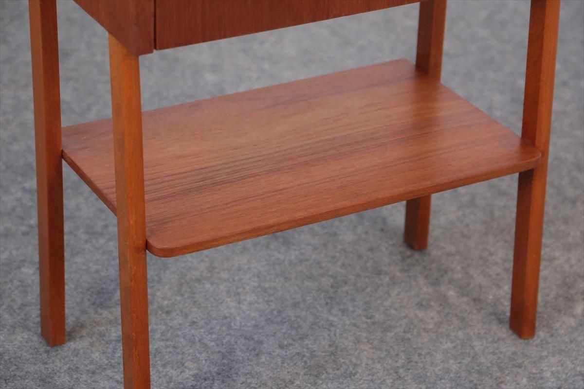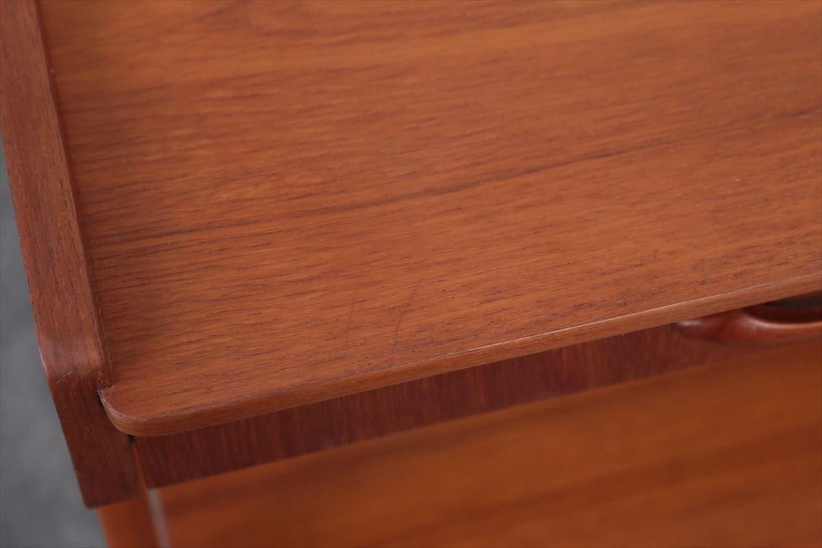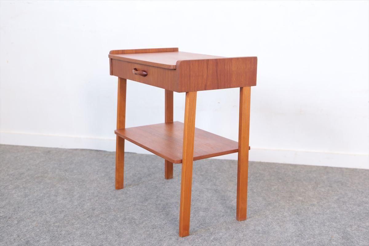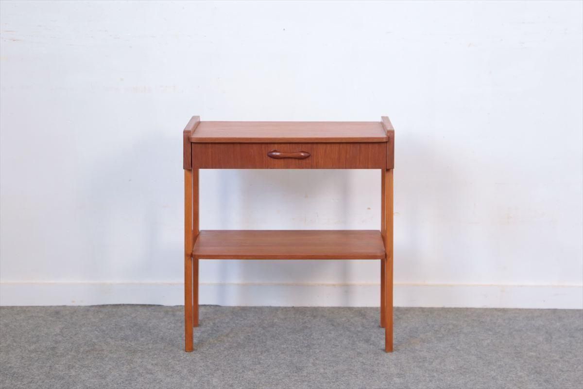 スウェーデンのチークのサイドテーブルです。 引き出しの持ち手がアクセントとなったコンパクトなデザインです。 ベッドサイドや玄関先、ちょっとしたスペースにアクセントとして置いてみるのも素敵です。 引き出しとラック付きで、本や雑誌、ちょっとした小物の収納に便利です。 箱部分とラック板はチーク、脚はビーチ材です。 画像のような細かいキズや凹みなど多少使用感はありますが、全体的には良いコンディションです。
