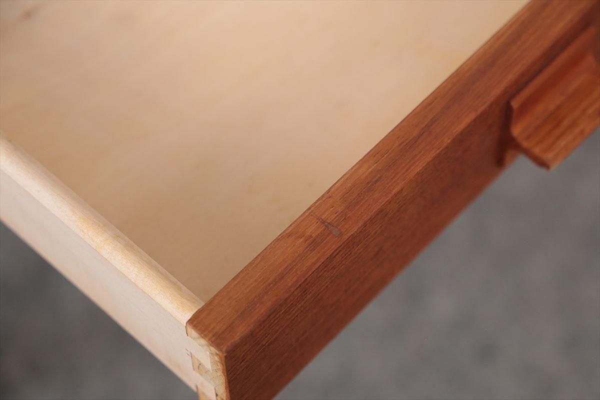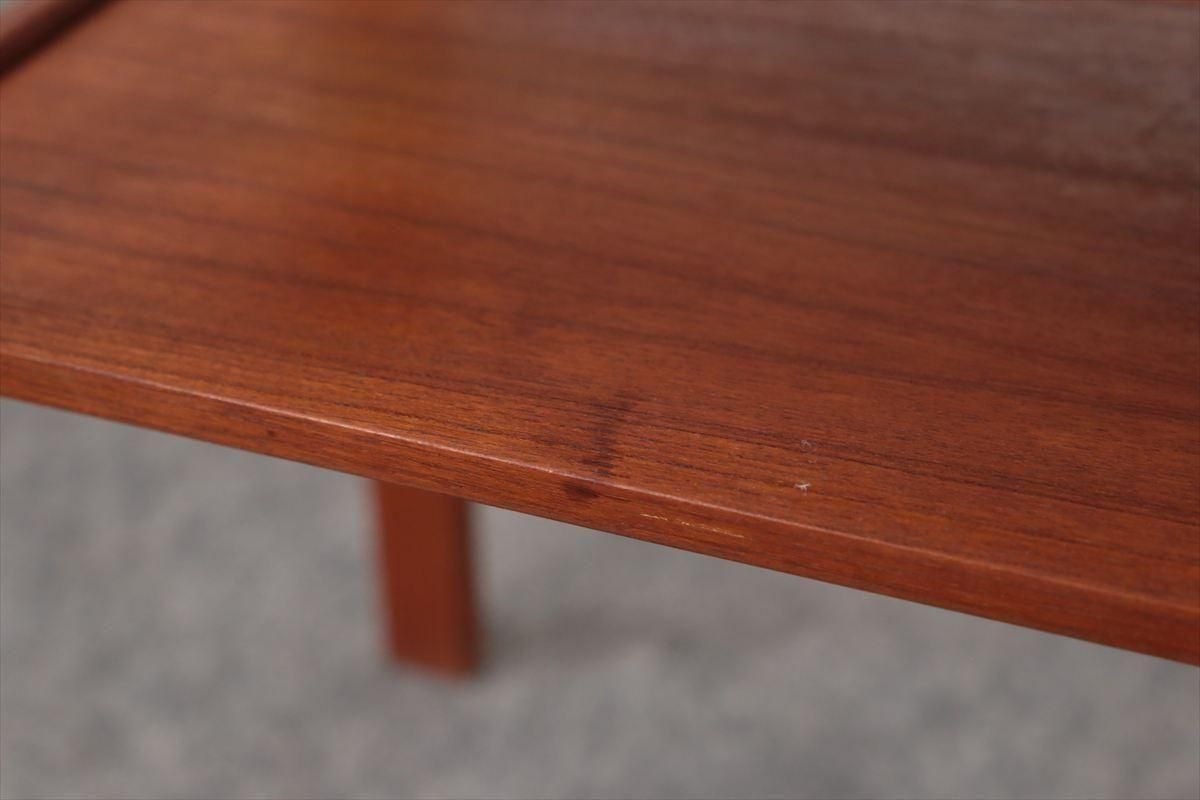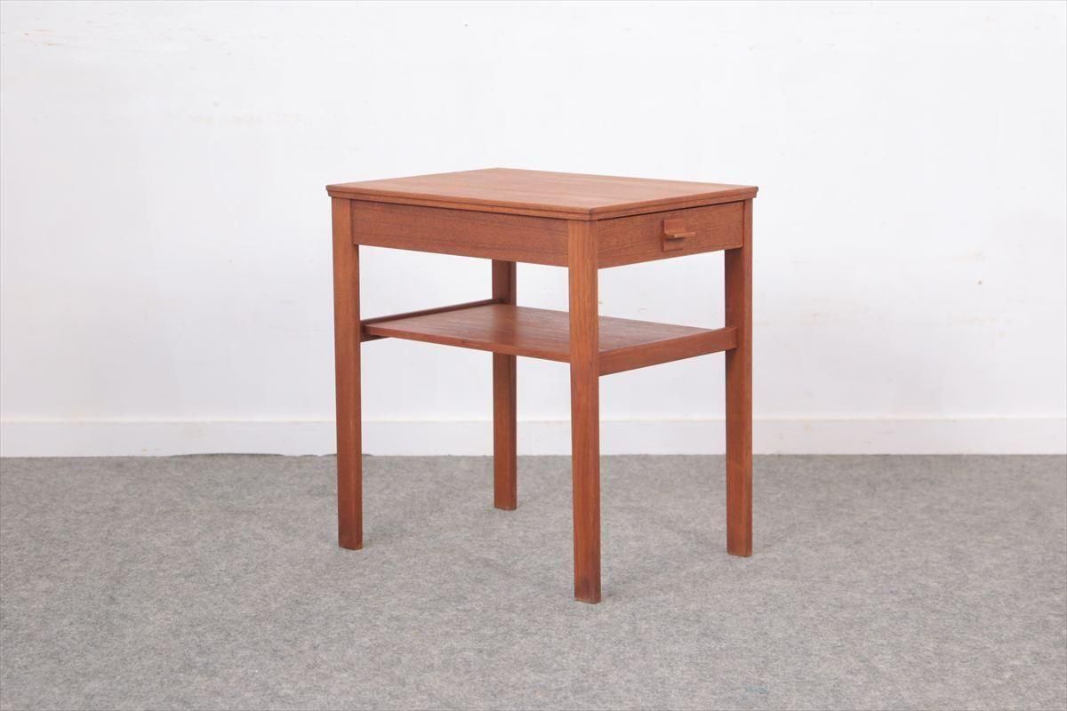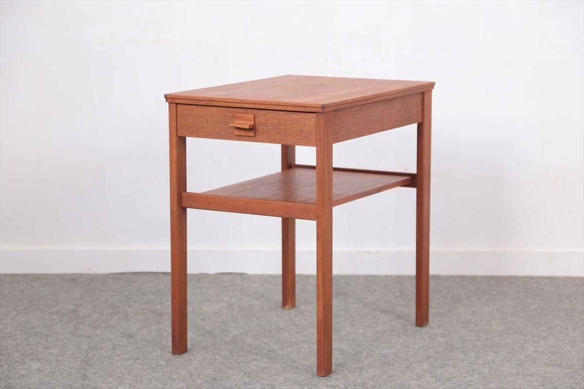 スウェーデンのチークのナイトテーブルです。 通常のサイドテーブルよりも奥行があるタイプで ベッドサイドなどの狭い空間にも収まりやすいコンパクトなサイズです。 引き出しとラック付きで、本や雑誌、ちょっとした小物などの収納に便利です。 ベッドサイドの他、ソファの横などちょっとしたスペースにアクセントとして置いてみるのも素敵です。 天板やラック部分に画像のようなしみがあります。 その他の細かいキズや凹みなど多少使用感はありますが、良いコンディションです。