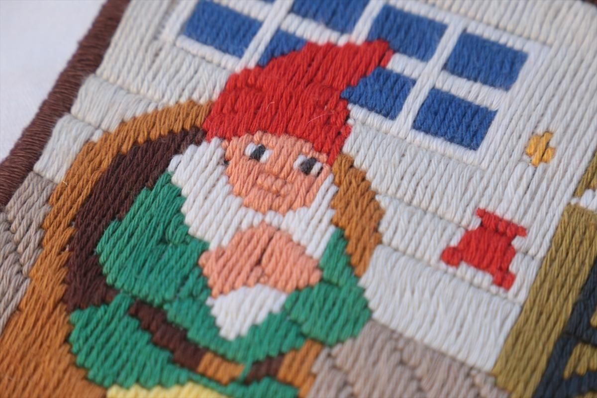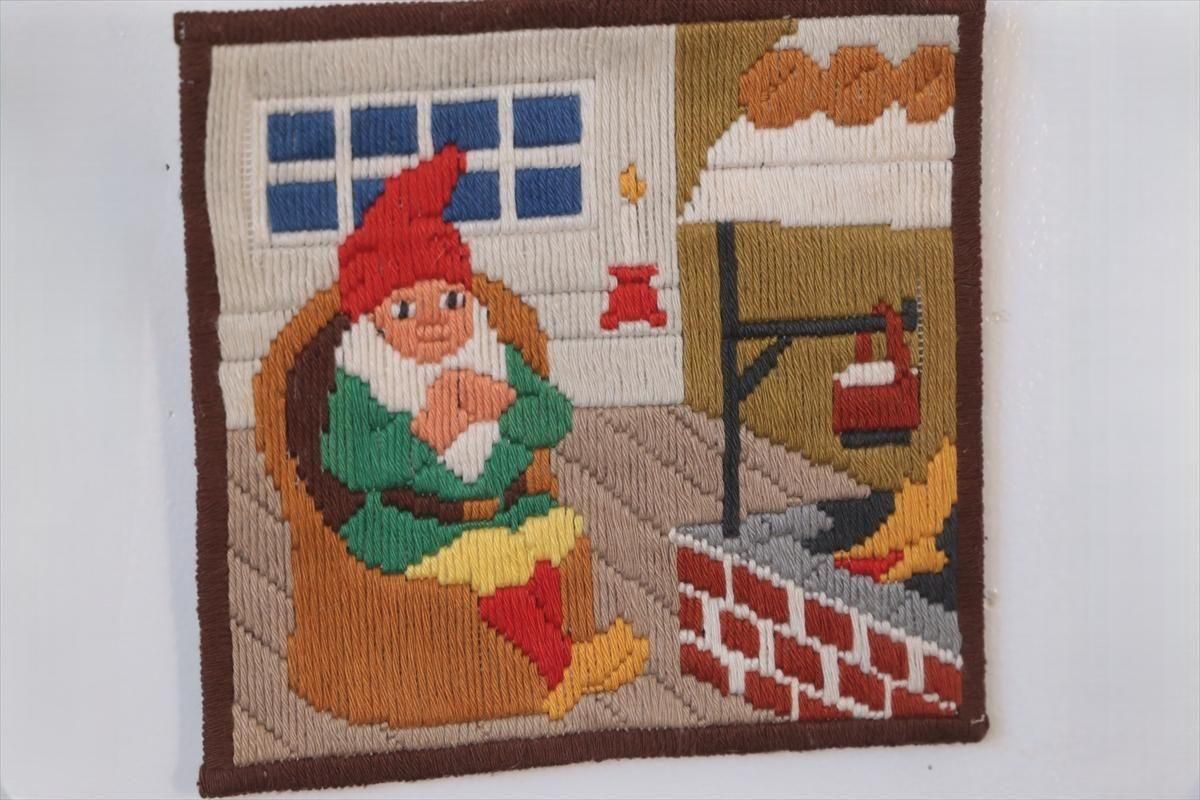 刺しゅうのミニタペストリーです。 暖炉でくつろぐトムテが描かれています。 素朴で味わいがあり、クリスマスのコーディネートのアクセントにぴったりです。 額装してもすてきです。 多少使用感はありますが、お楽しみいただけることと思います。