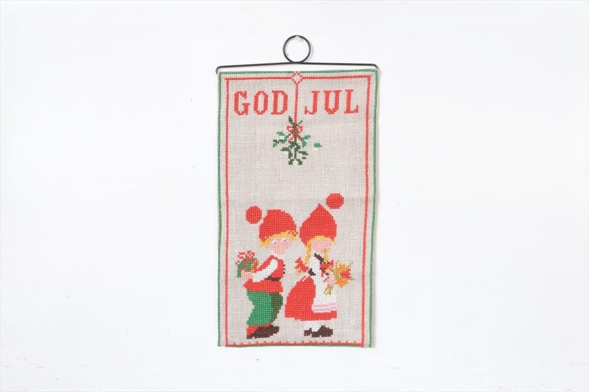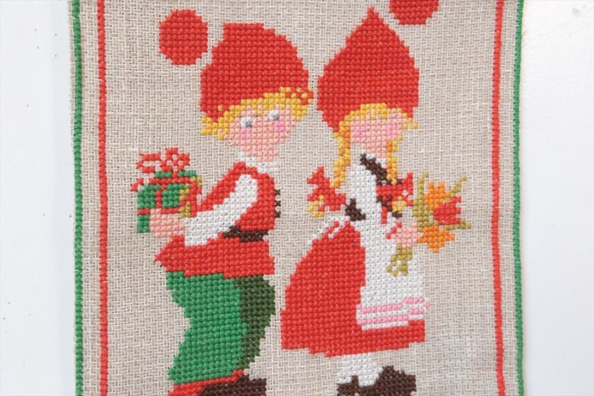 クロスステッチ刺しゅうのタペストリーです。 プレゼントを手に照れくさそうな男の子と女の子が可愛らしいです。 クロスステッチで丁寧に描かれています。 北欧のクリスマスの雰囲気をお楽しみいただけます。 多少使用感はありますが、お楽しみいただけることと思います。