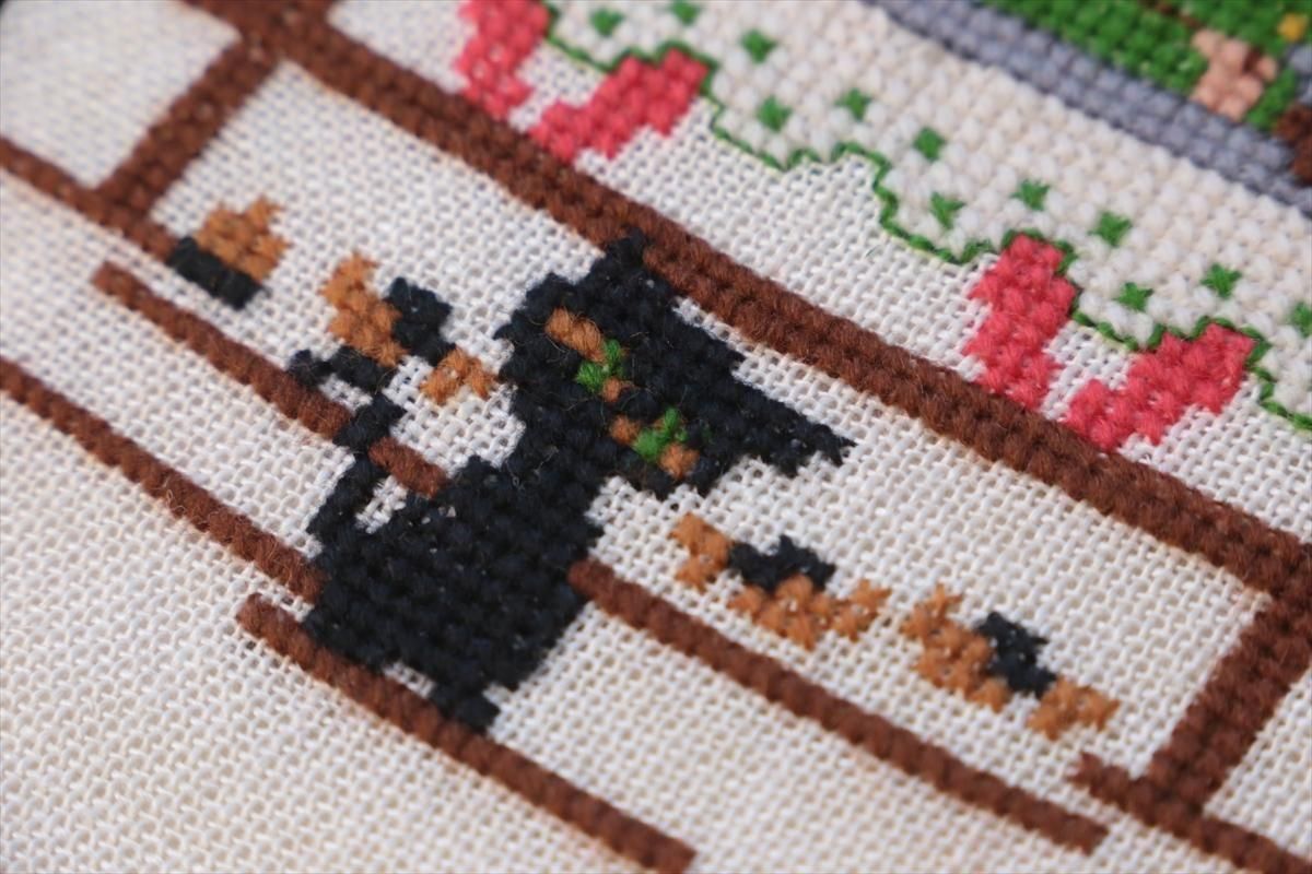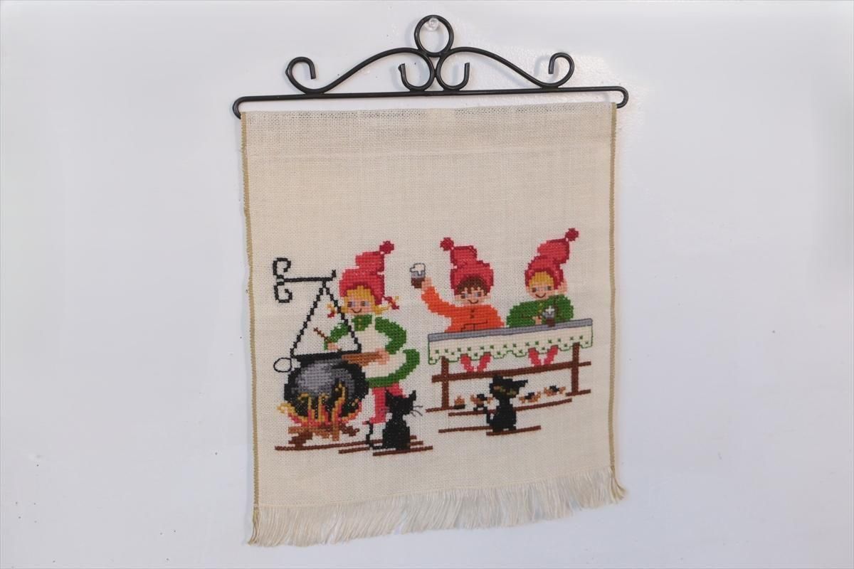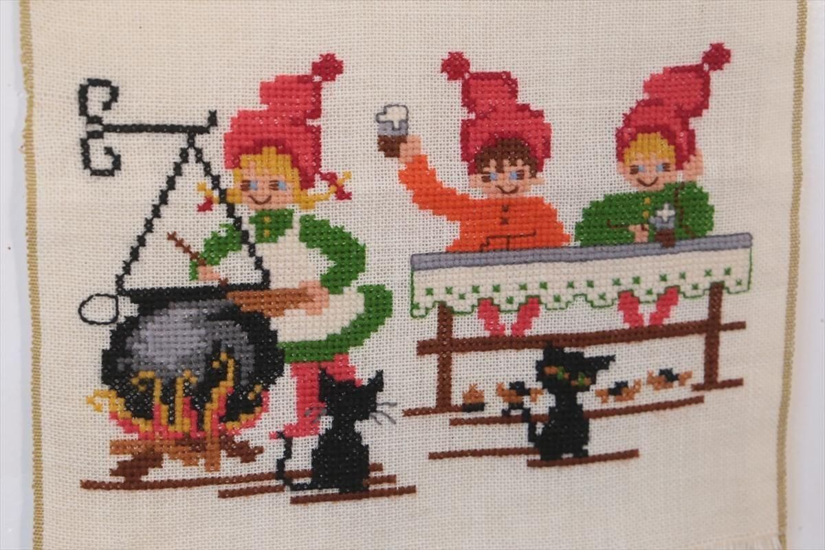 刺しゅうのタペストリーです。 楽しそうに料理するトムテたちが クロスステッチ刺しゅうで描かれています。黒猫たちの姿もかわいいです。 クリスマスのコーディネートにぴったりの楽しい雰囲気です。 多少使用感はありますが、お楽しみいただけることと思います。