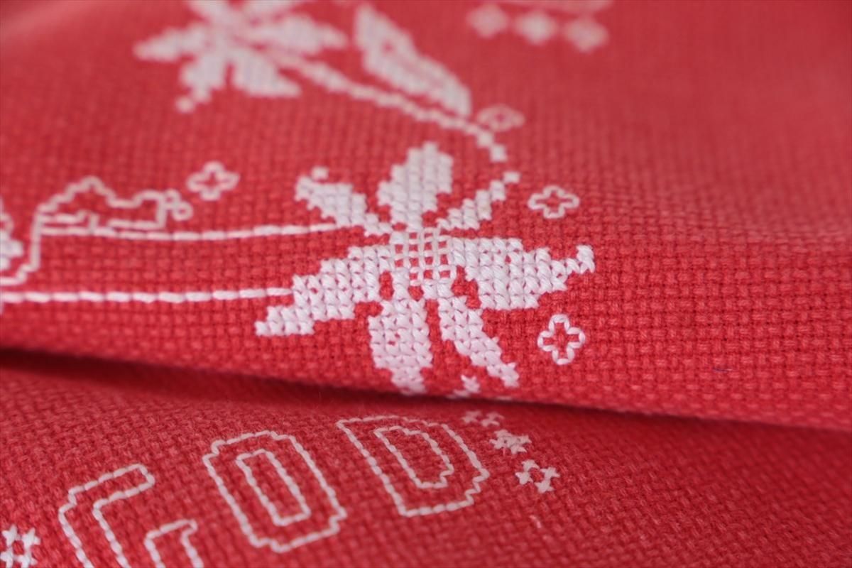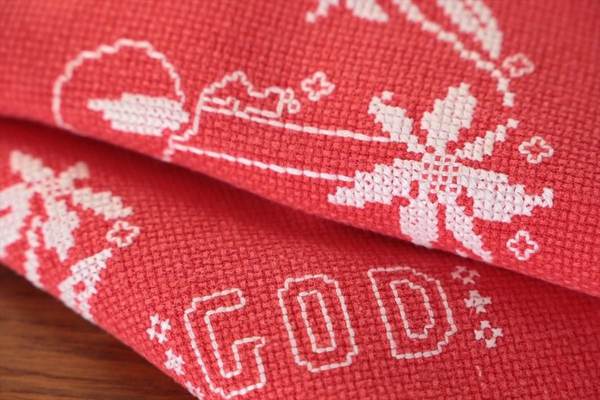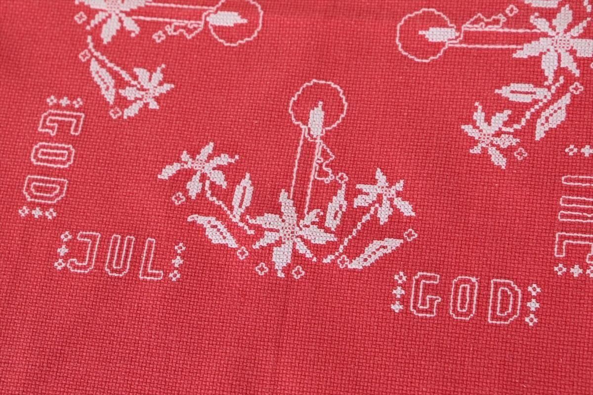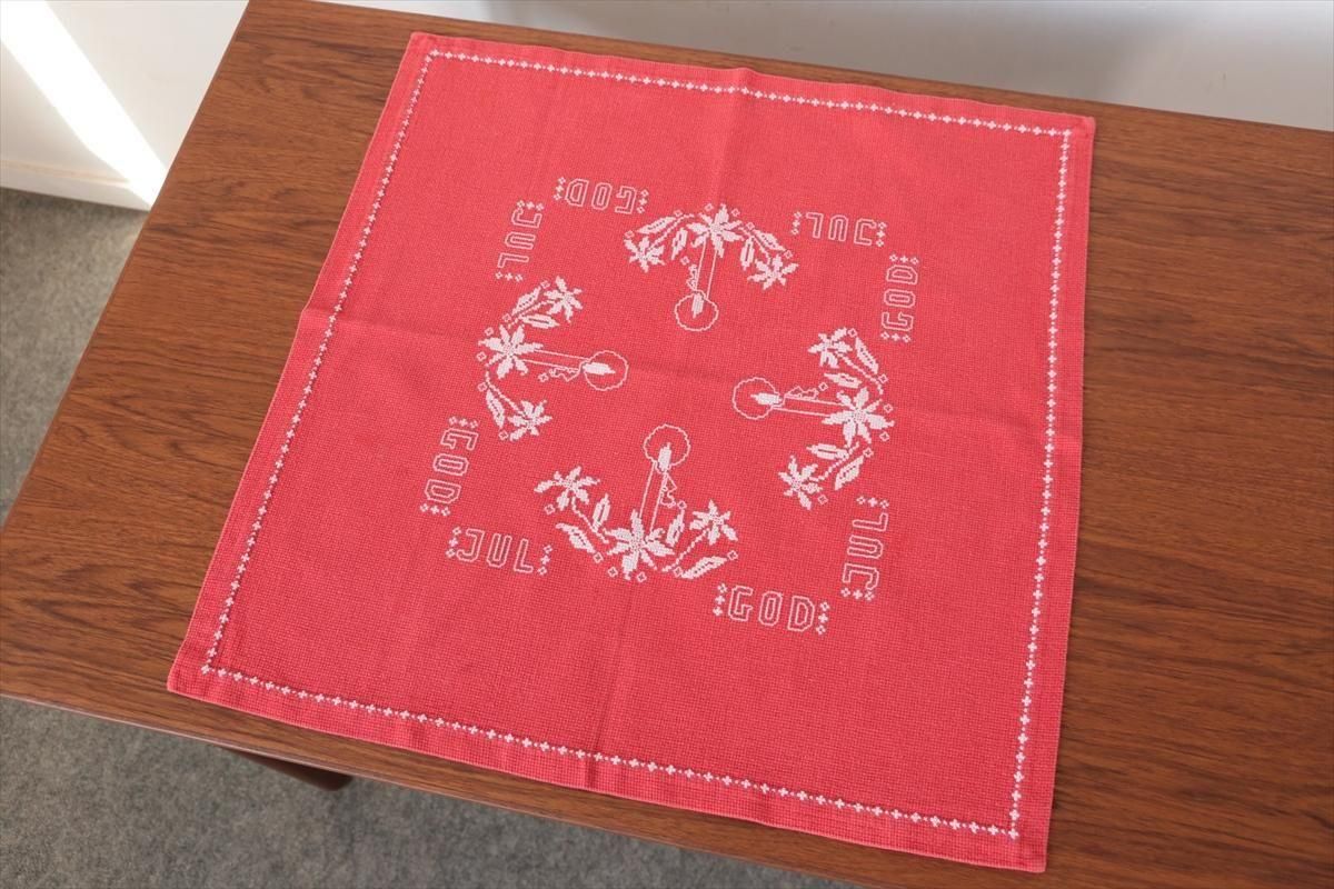 クロスステッチの小さなテーブルクロスです。 スウェーデン語でメリークリスマスを意味する「GODJUL」の文字と かわいいキャンドルがとても丁寧に刺しゅうされています。 壁に飾ったり、テーブルコーディネートなどにおすすめです。 多少使用感はありますが、お楽しみいただけることと思います。