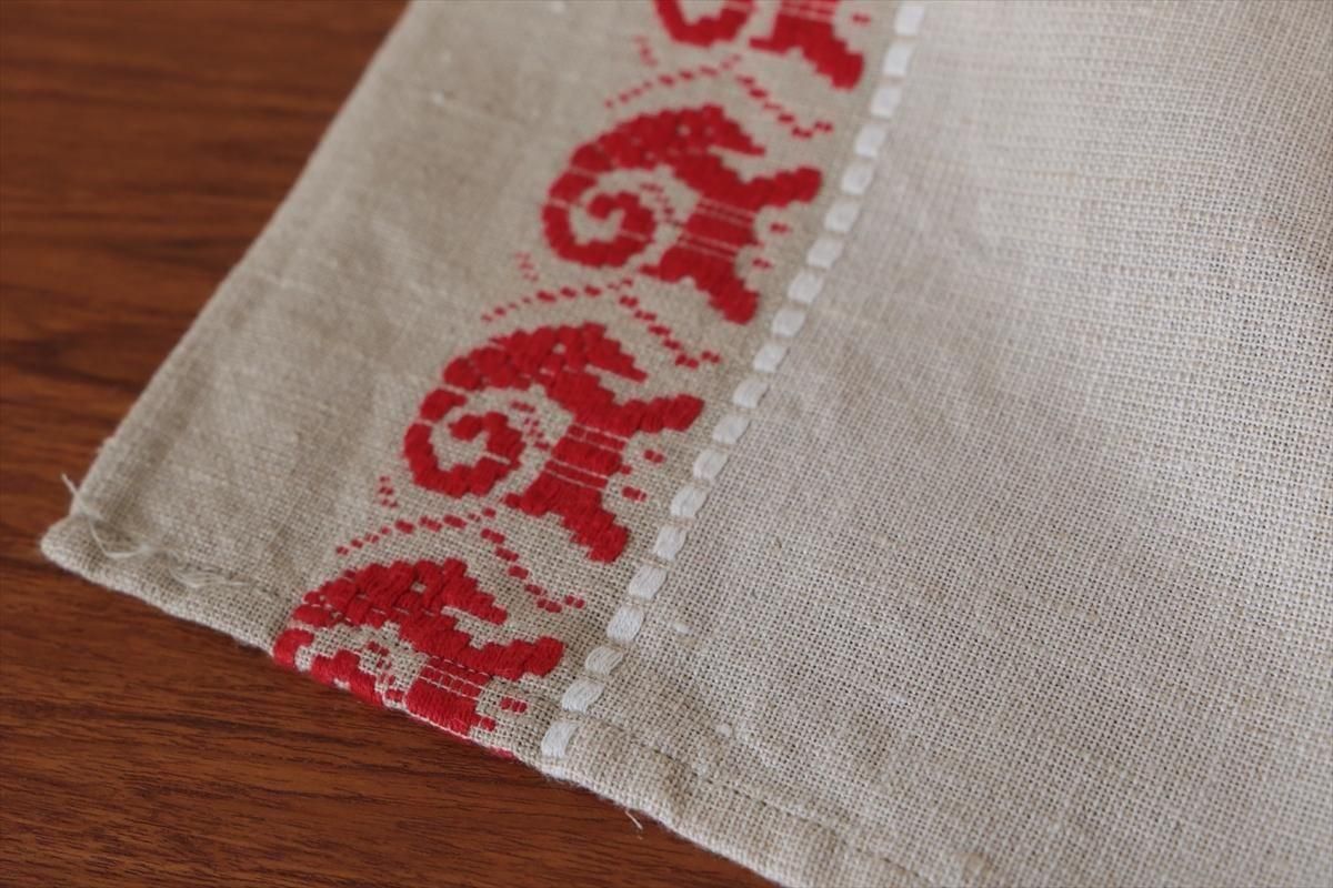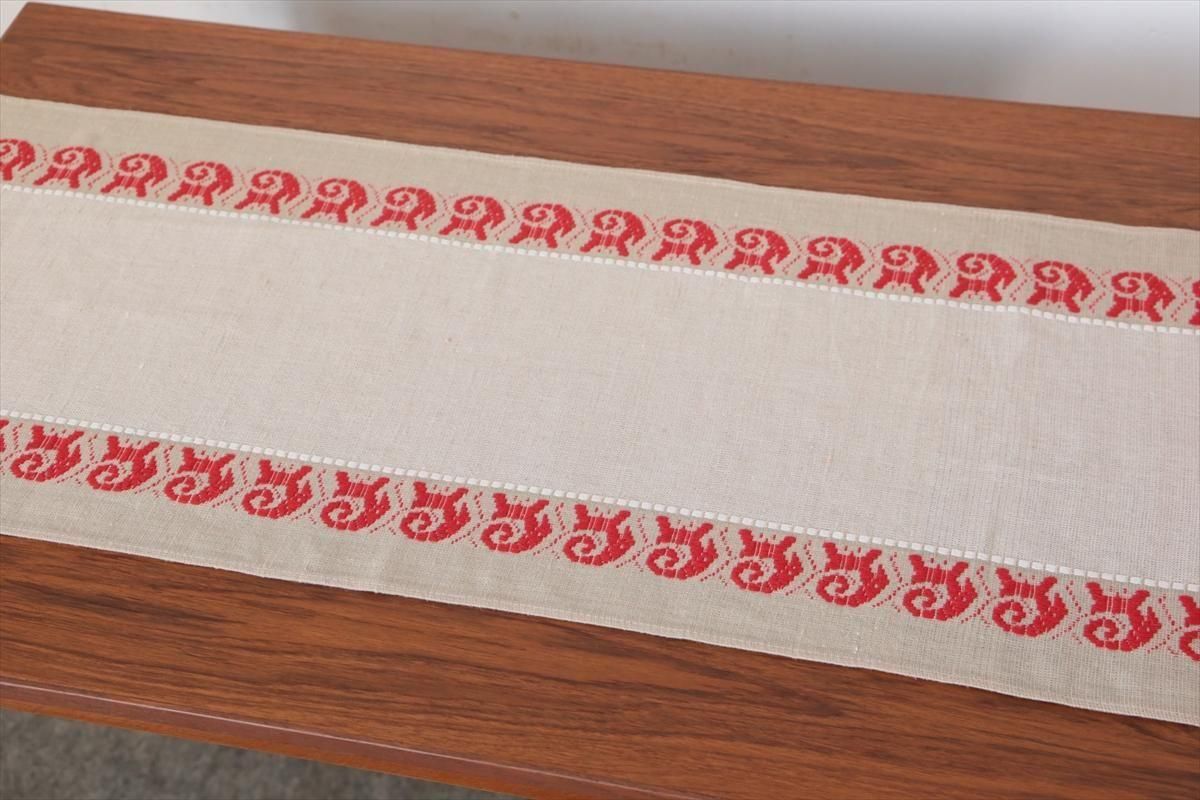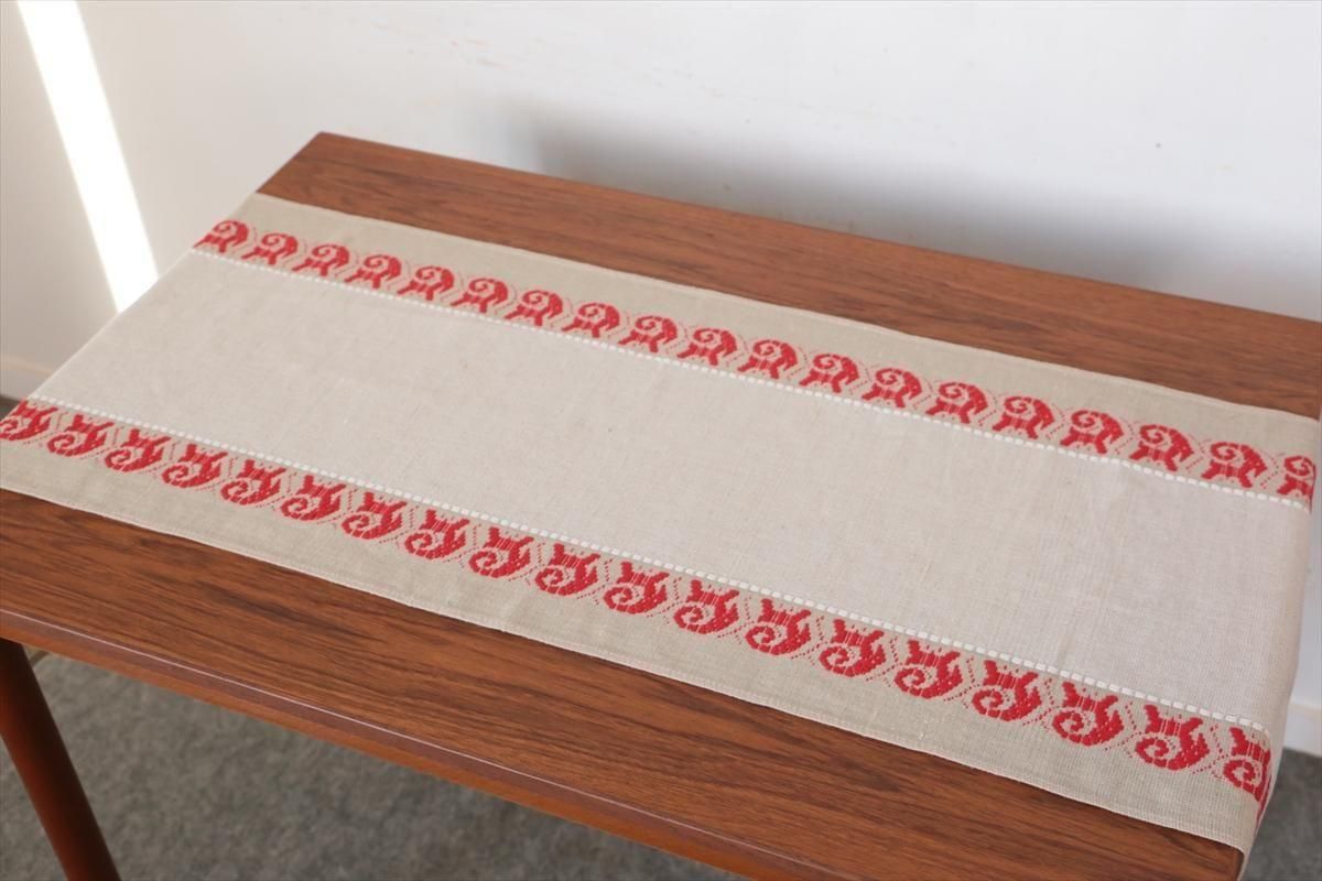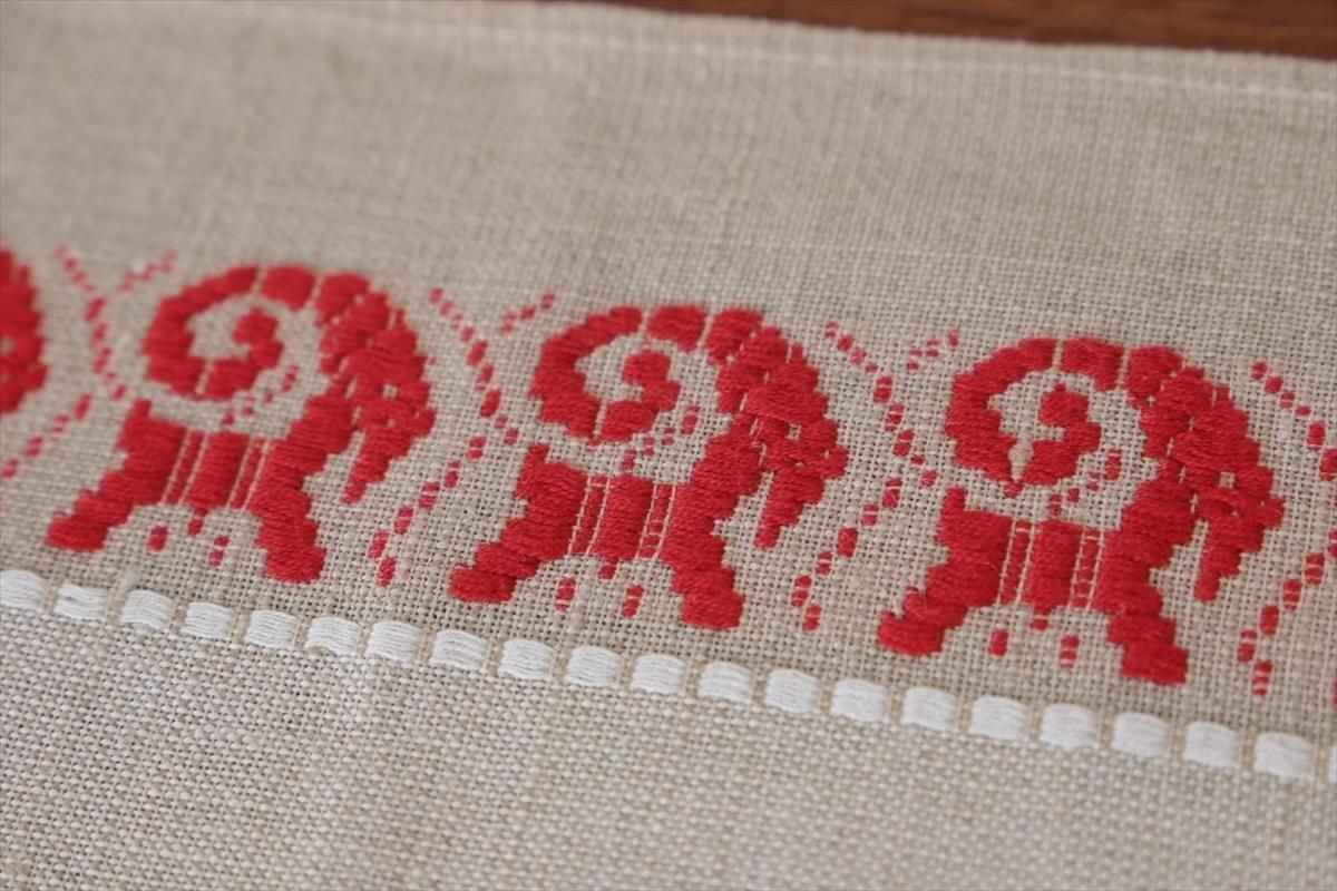 ユールボックの刺しゅうがかわいいテーブルセンターです。 ユールボックは北欧の伝統的なクリスマスのシンボルです。 テーブルセンターや窓に飾ったり、北欧のクリスマスの雰囲気をお楽しみいただけます。 麻と化繊の柔らかな風合いの生地です。 糸のつれなど多少使用感はありますが、お楽しみいただけることと思います。