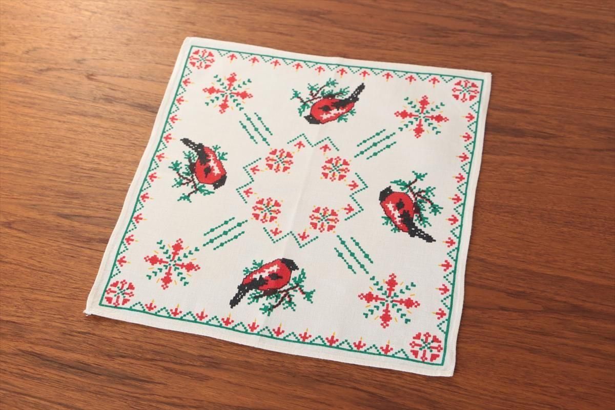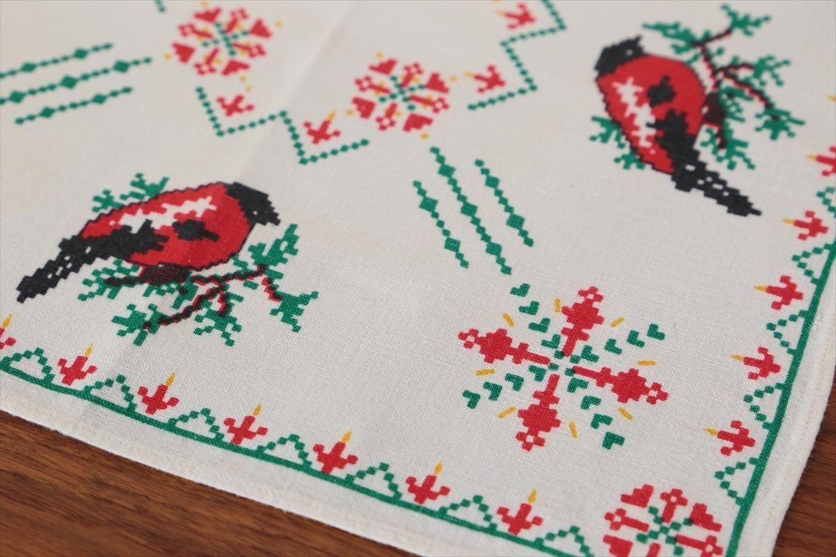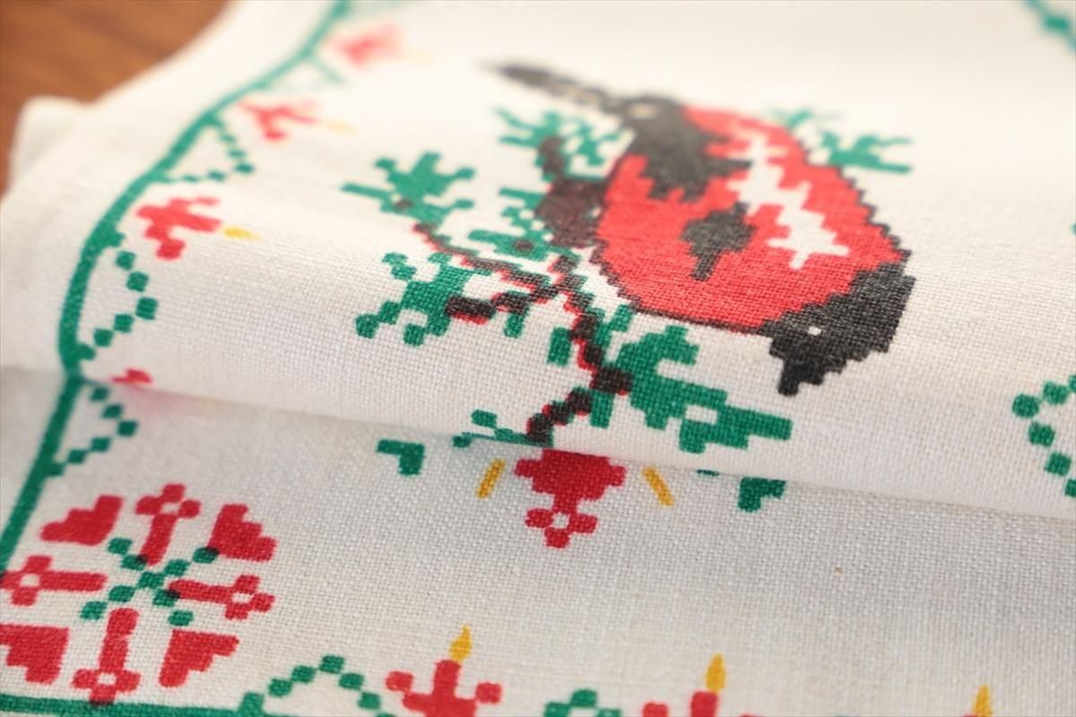クリスマスのテーブルセンターです。 クリスマスの赤い鳥とクリスマスのモチーフがとてもかわいらしく描かれています。 さりげなくクリスマスのコーディネートを演出してくれます。 麻のしなやかな風合いです。 多少使用感はありますが、お楽しみいただけることと思います。