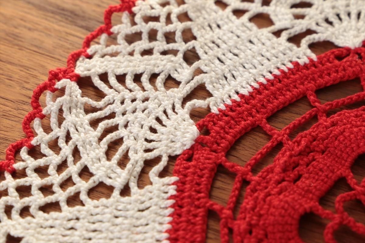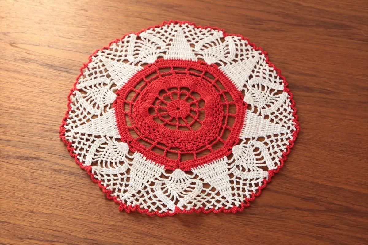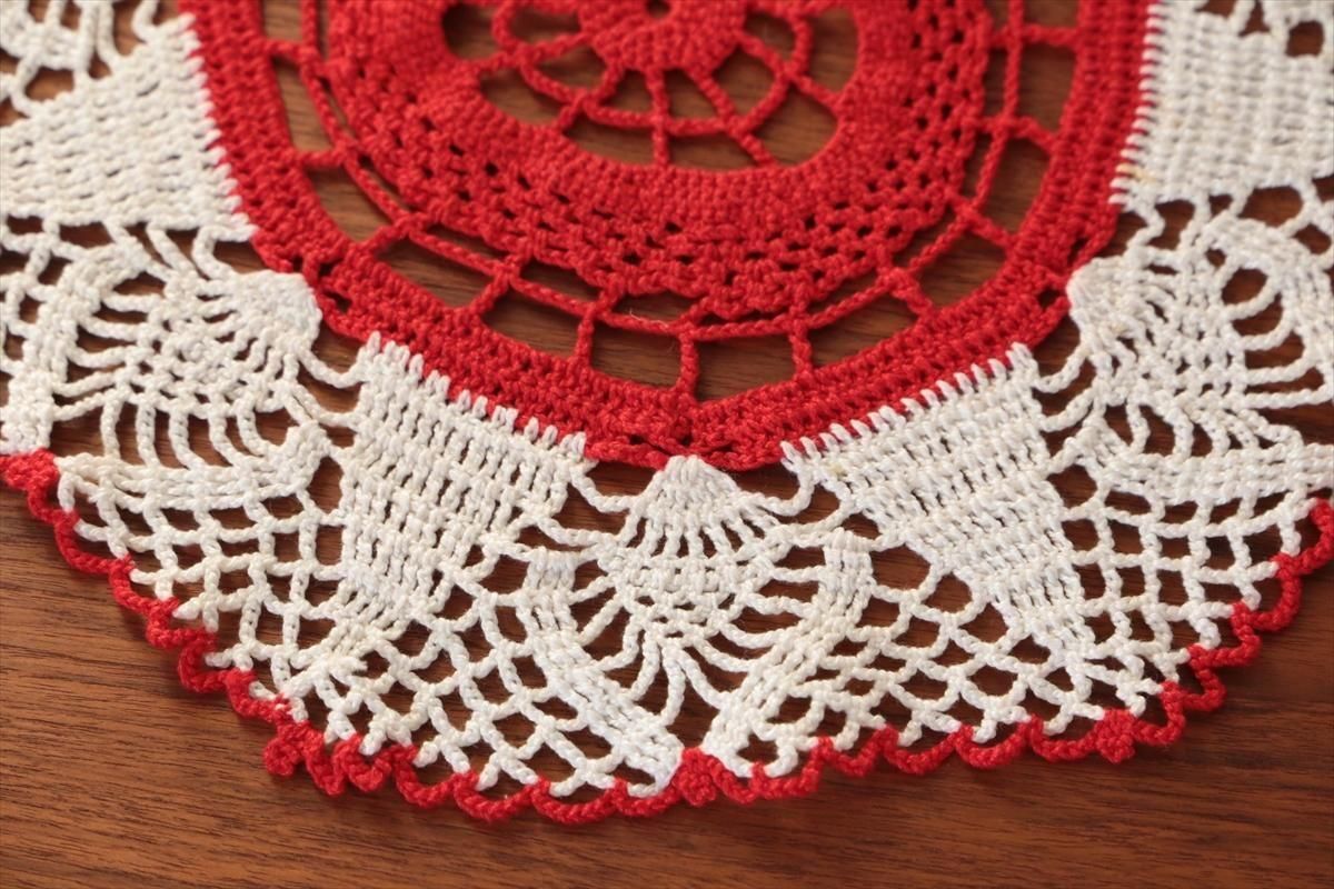 赤と白の手編みのドイリーです。 クリスマスのテーブルコーディネートにぴったりです。 柔らかな綿の糸です。 多少使用感はありますが、お楽しみいただけることと思います。