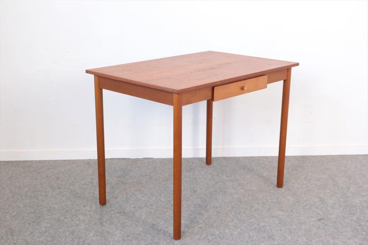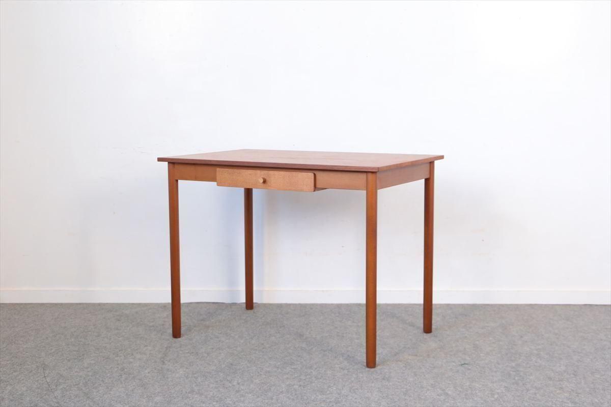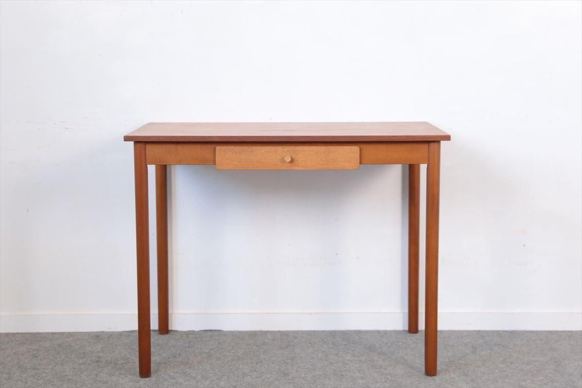 デンマークの小さなデスクです。天板はチーク、脚や幕板はビーチで構成されています。 天板幅が94cmとコンパクトで書き物はもちろん、ちょっとした作業台としても使用できます。 引き出しが1段あり、卓上の細々した物をすっきり収納できそうです。 こちらのデスクは裏側もきれいな仕上で、空間に配置することもできます。 小さなキズなど多少使用感はありますが、良いコンディションです。