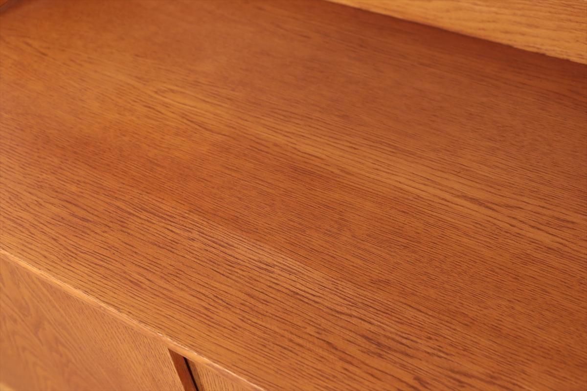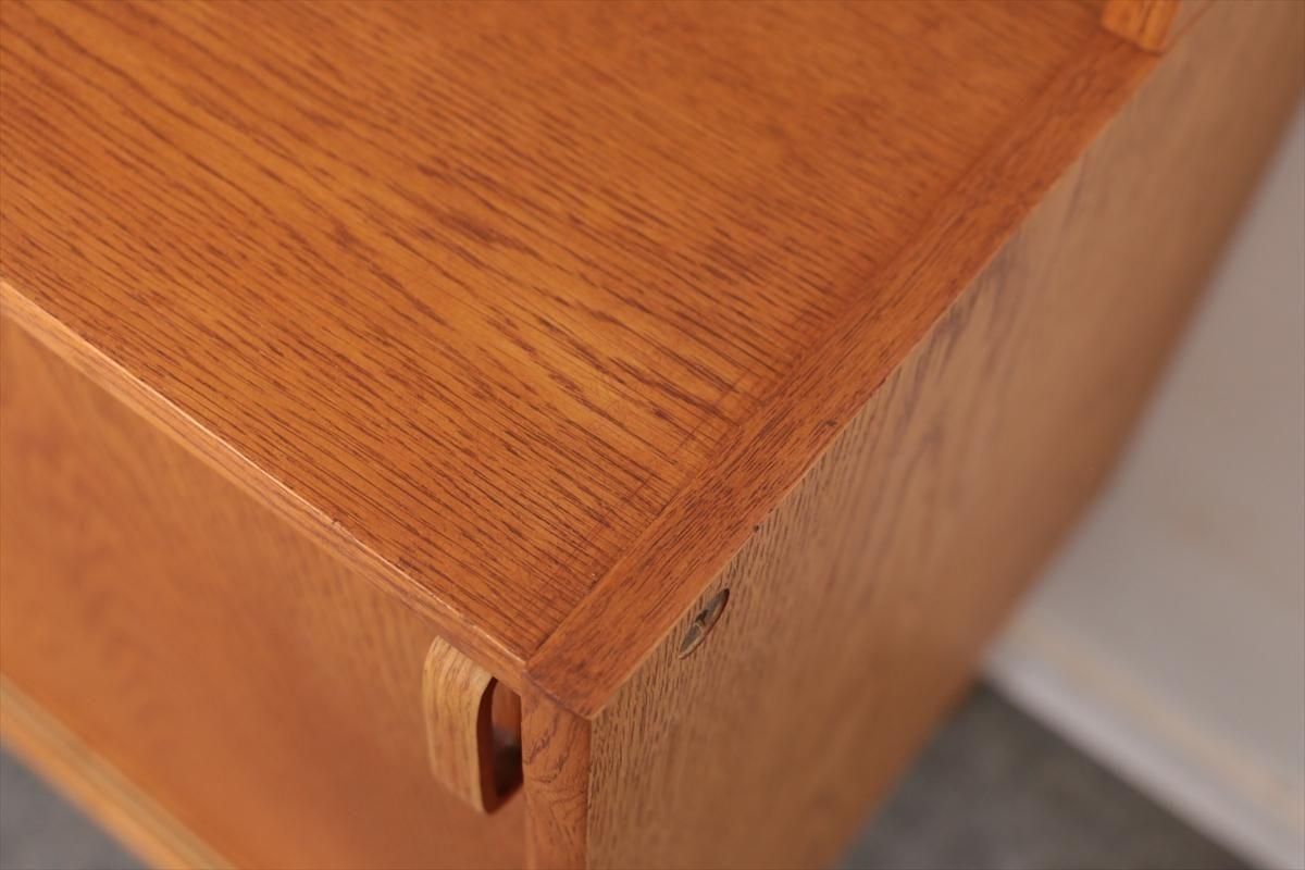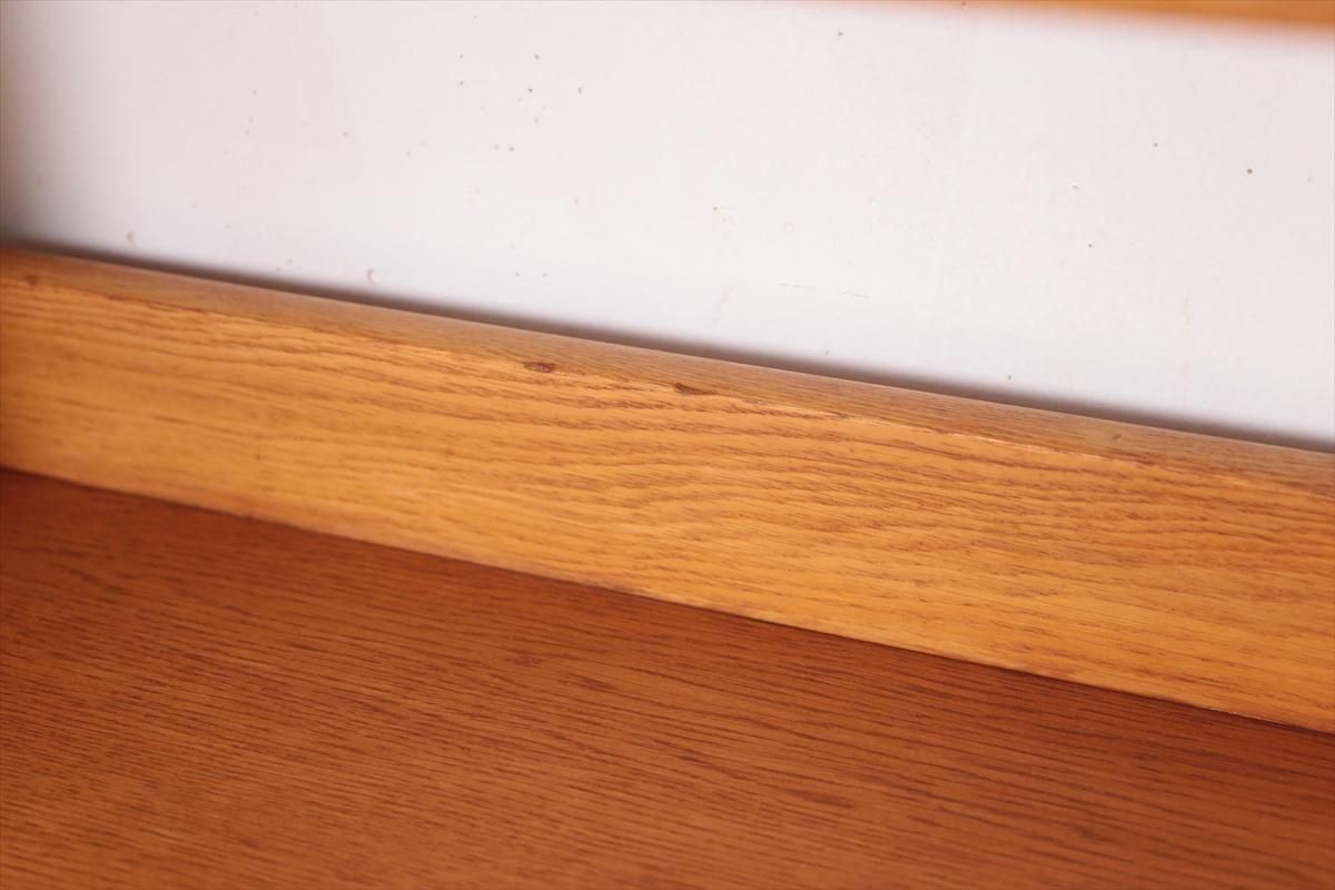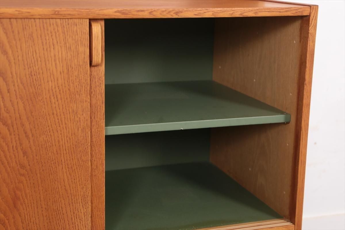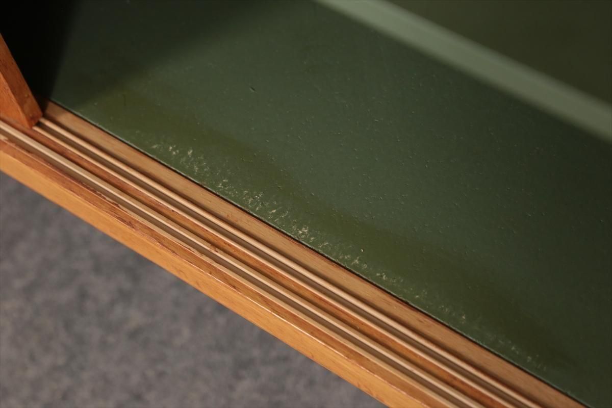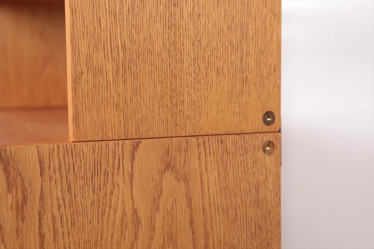 スウェーデンの家具メーカーBodaforsのオークのブックケースです。 スウェーデンの建築家、家具デザイナーのBertil Fridhagenによるデザインです。 こちらのシリーズはデザインの違うタイプを組み合わせて連結したり、上下を別で使用できるように販売されていた家具のようです。そのため側面に連結用の穴が開いています。グリーンカラーの背板や、アーチ型の持ち手のデザインがアクセントです。 同シリーズを並べて使用するのも素敵ですね。 天板に画像のような色むらや、端の部分に薄いキズがあります。 その他の細かいキズや凹み、わずかな欠けなど多少使用感はありますが、がたつきなどはなく良いコンディションです。