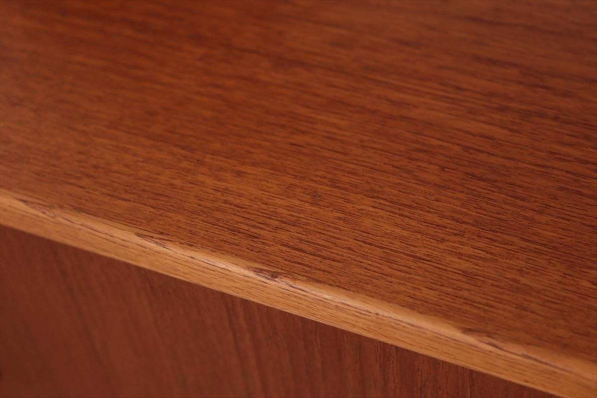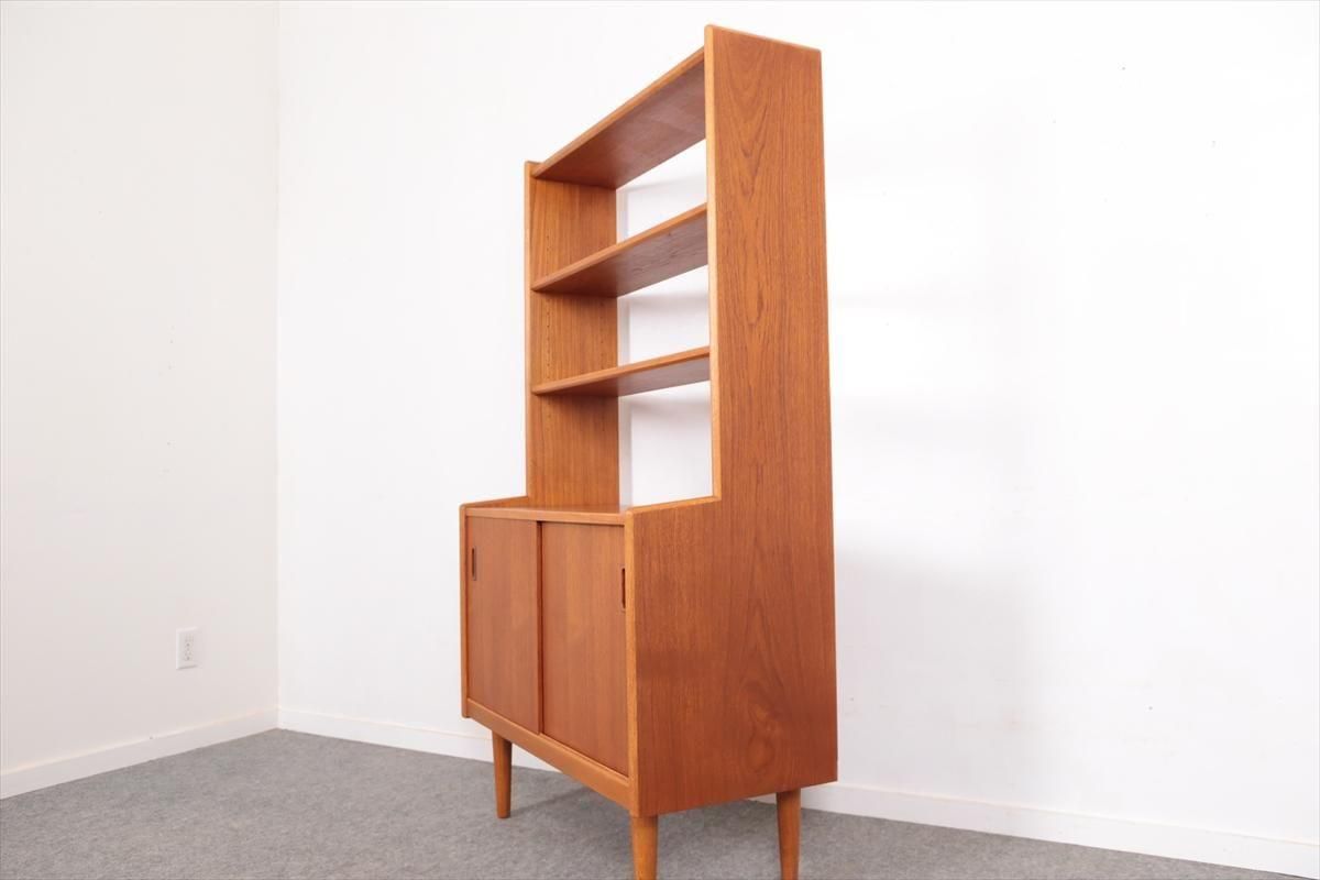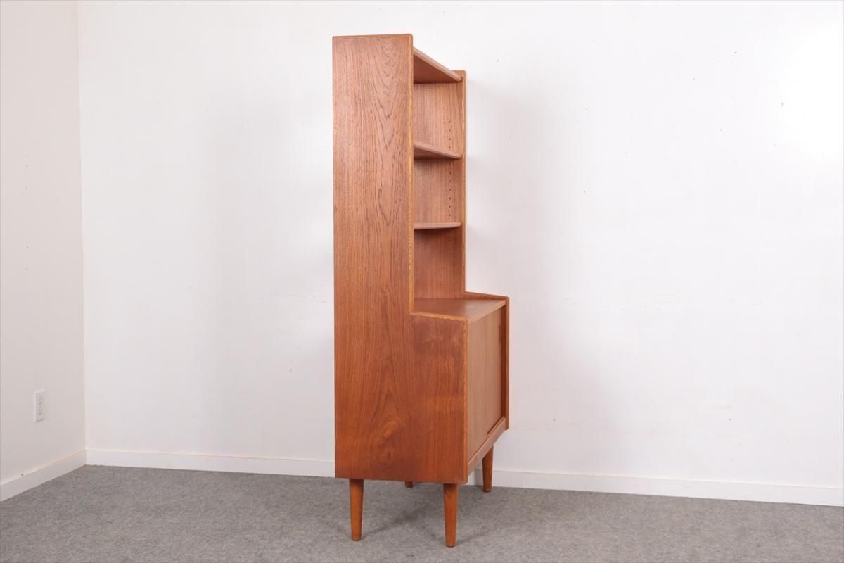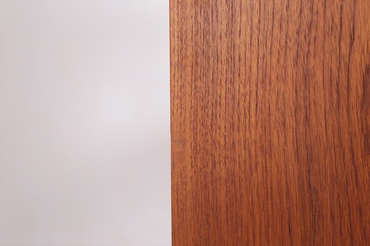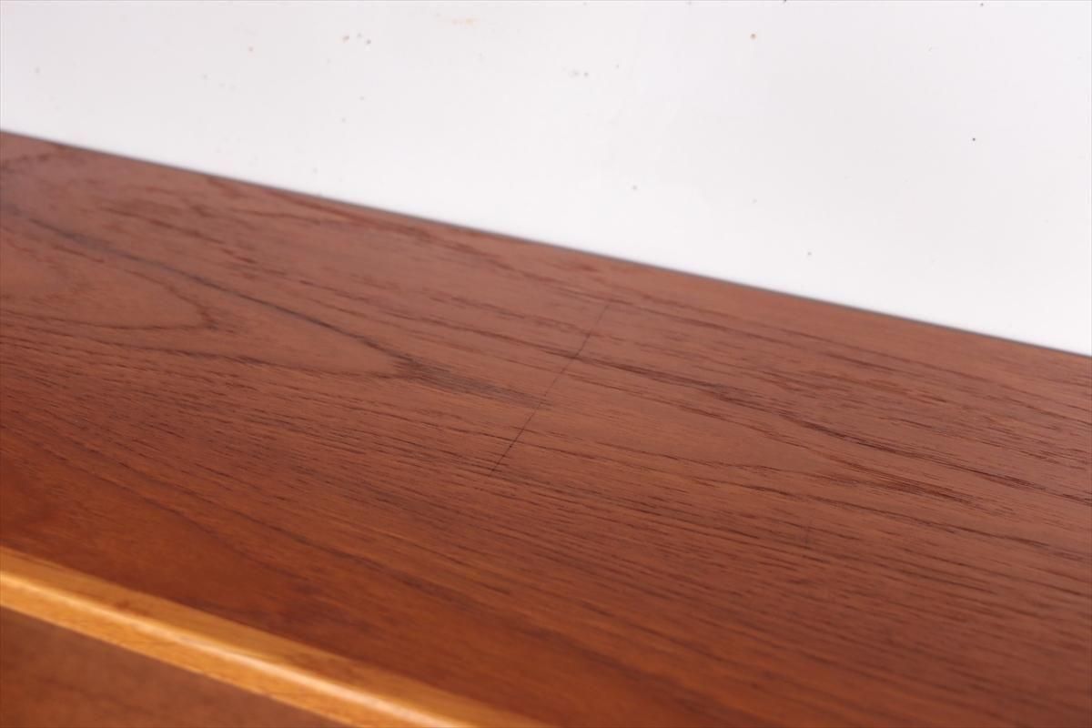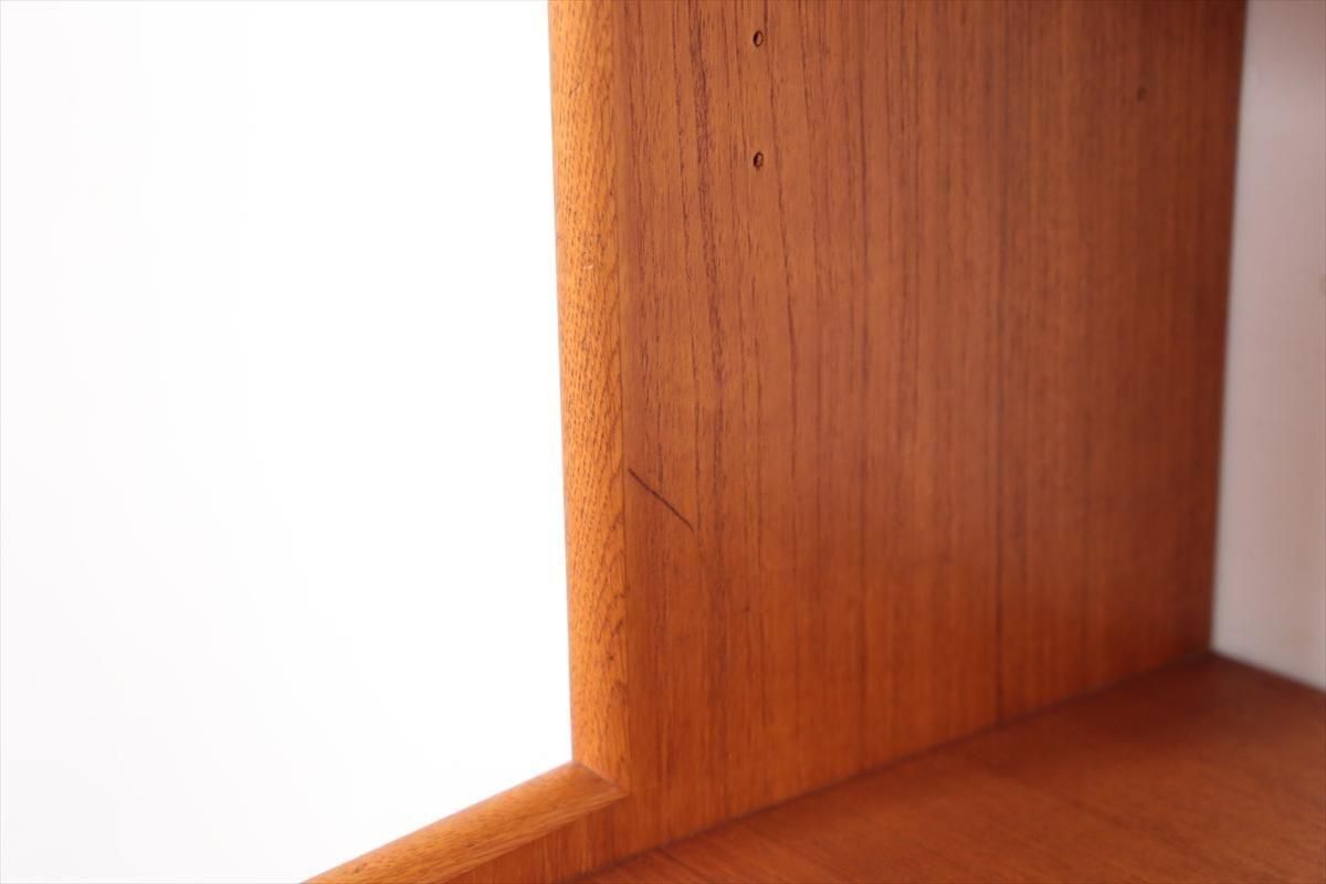スウェーデンのチークの本棚です。 チークとオークのさりげないコントラストがデザインのアクセントとなったシンプルなデザインです。 本や雑誌、お気に入りのコレクションや小さなものを飾ったり、 キッチンやリビングなどで機能的にご使用いただけます。 上段の棚板は16段階の高さ調節が可能です。 下段は引き戸タイプのため、奥行の狭い場所でも物の出し入れがスムーズです。 棚板は5段階の高さ調節が可能です。 上段の角に画像のような欠けや補修箇所があります。 またその他にも細かいキズや凹みが数か所にあります。 多少使用感はありますが、造りはしっかりとしており、良いコンディションです。 横板にわずかな色むらや、角に欠けを補修した箇所があります。 その他の細かいキズや凹みなど 多少使用感はありますが、造りはしっかりとしており良いコンディションです。