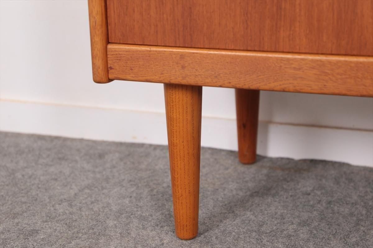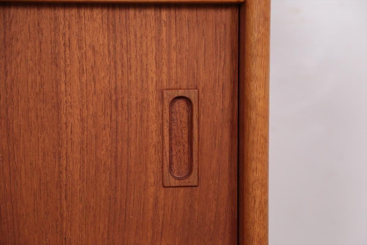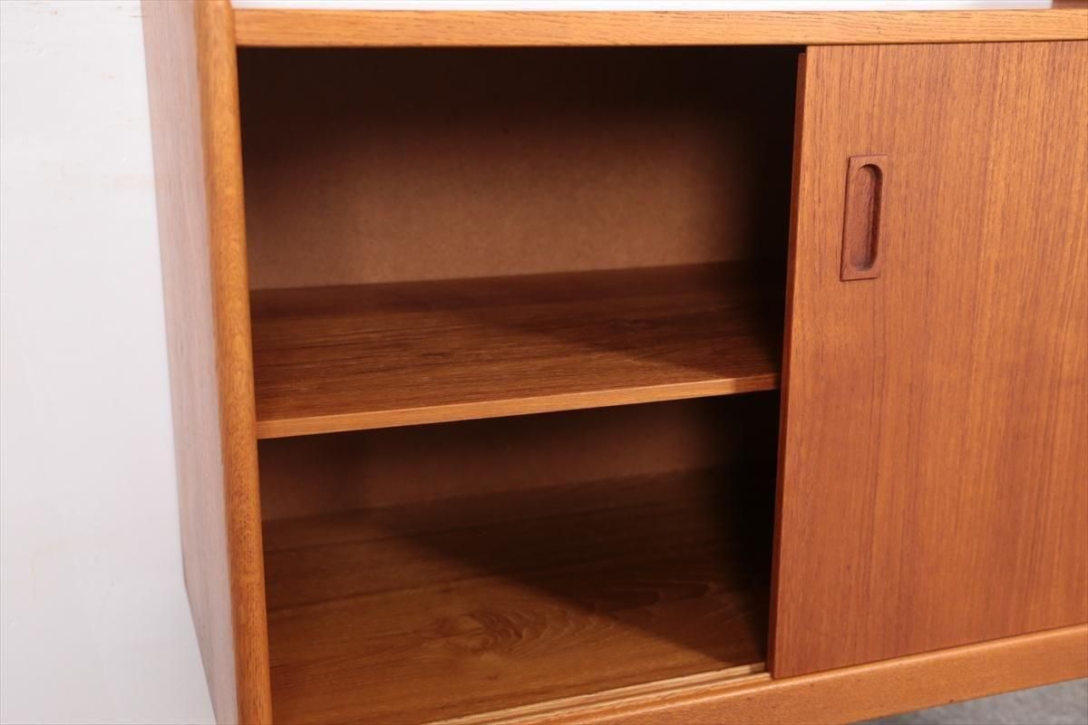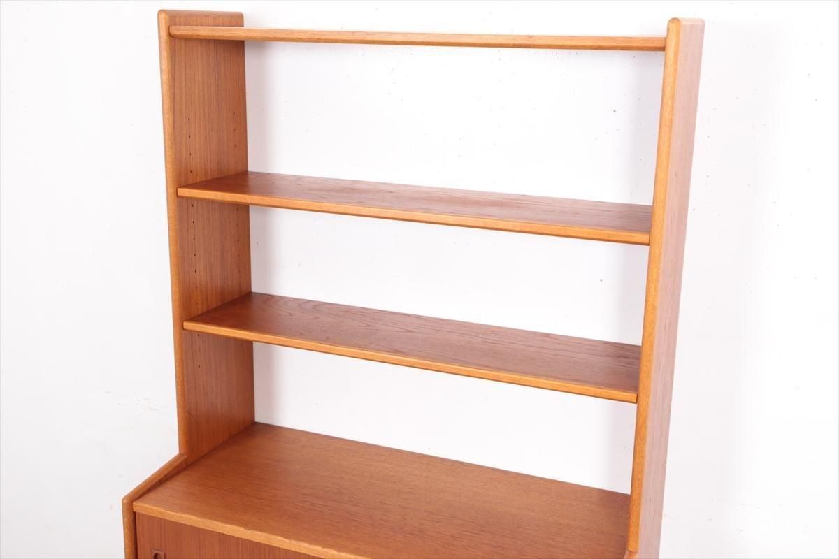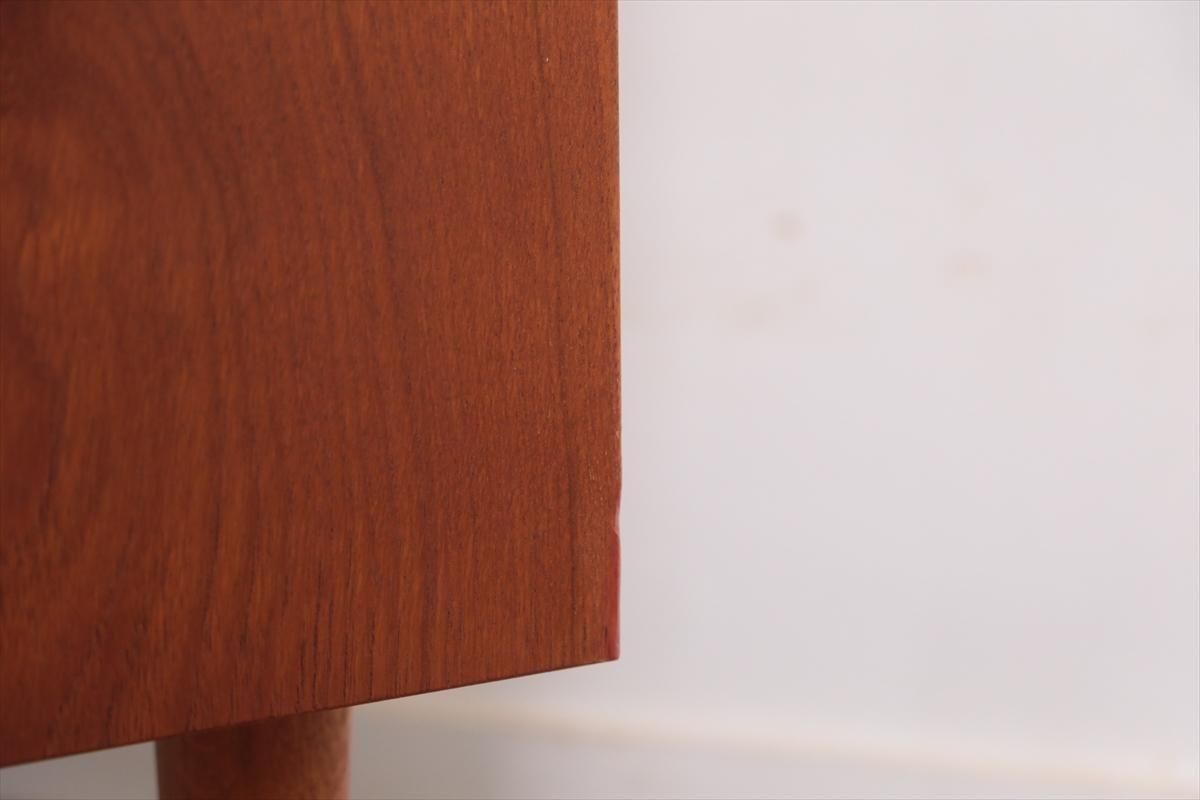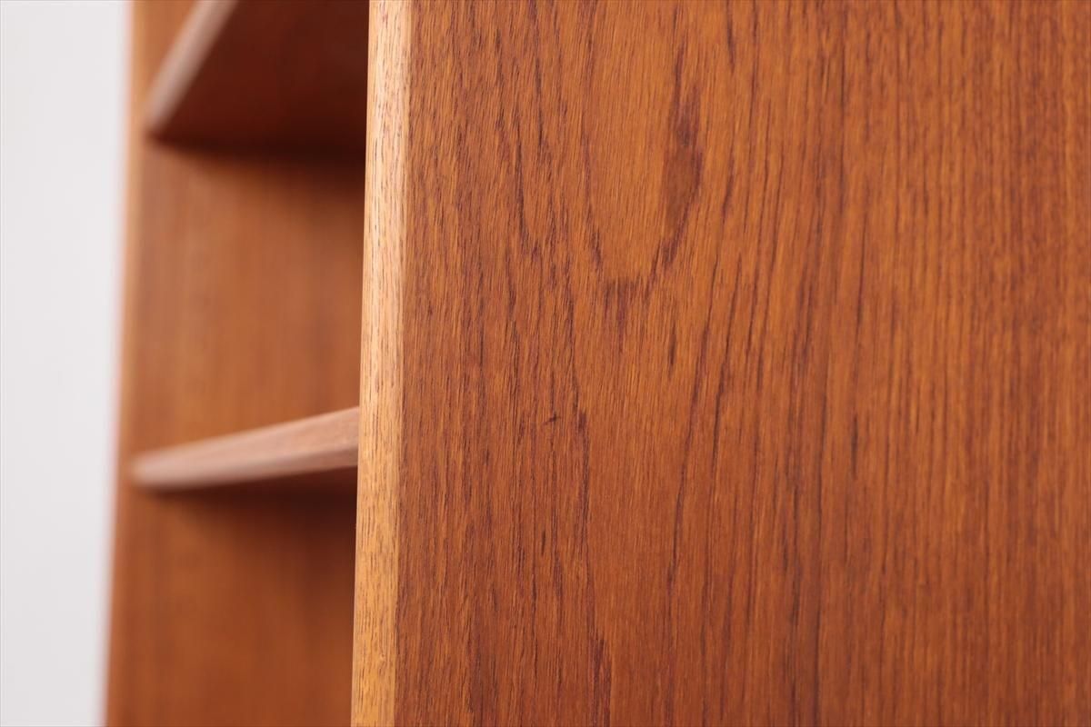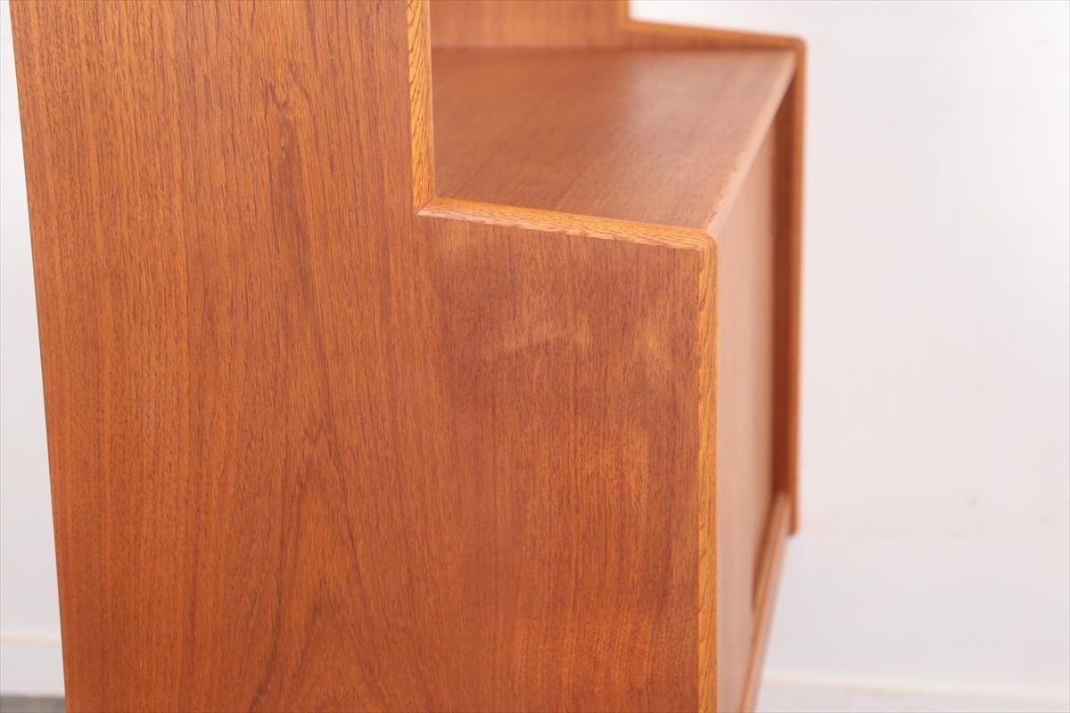 スウェーデンのチークの本棚です。 チークとオークのさりげないコントラストがデザインのアクセントとなったシンプルなデザインです。 本や雑誌、お気に入りのコレクションや小さなものを飾ったり、 キッチンやリビングなどで機能的にご使用いただけます。 上段の棚板は16段階の高さ調節が可能です。 下段は引き戸タイプのため、奥行の狭い場所でも物の出し入れがスムーズです。 棚板は5段階の高さ調節が可能です。 上段の角に画像のような欠けや補修箇所があります。 またその他にも細かいキズや凹みが数か所にあります。 多少使用感はありますが、造りはしっかりとしており、良いコンディションです。 横板にわずかな色むらや、角に欠けを補修した箇所があります。 その他の細かいキズや凹みなど 多少使用感はありますが、造りはしっかりとしており良いコンディションです。