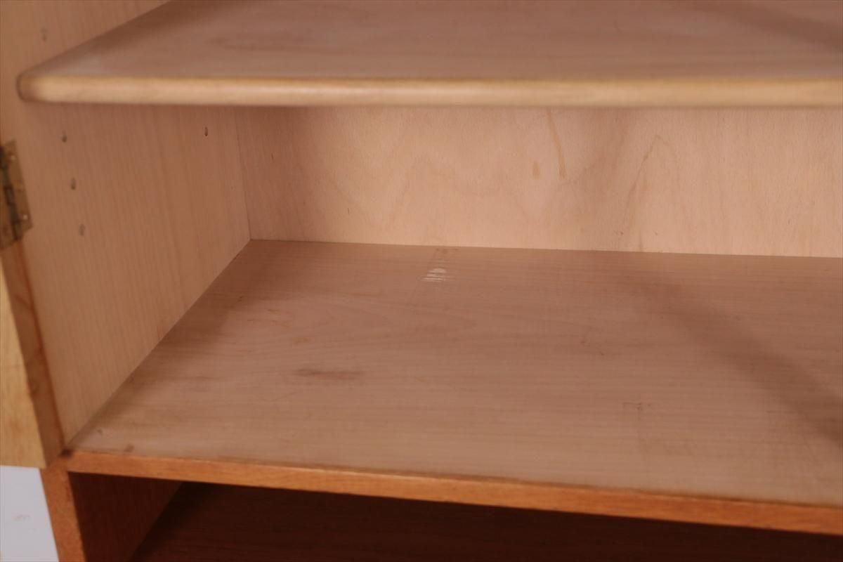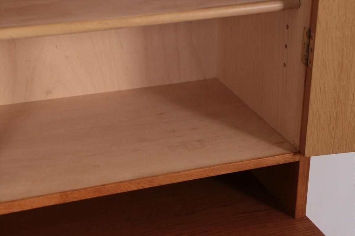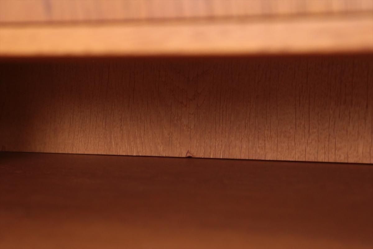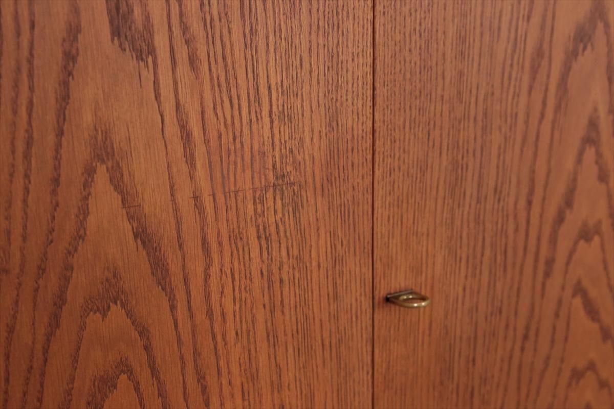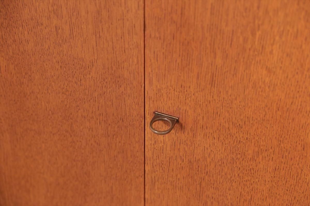 扉は真鍮の持ち手で、指を引っ掛けて左に引くと扉が開きます。 当時は上下を自由に組み合わせることができるシリーズとして販売されていたようで、 今回のこちらの本棚は上の型番がRY14、下がRY15と呼ばれています。