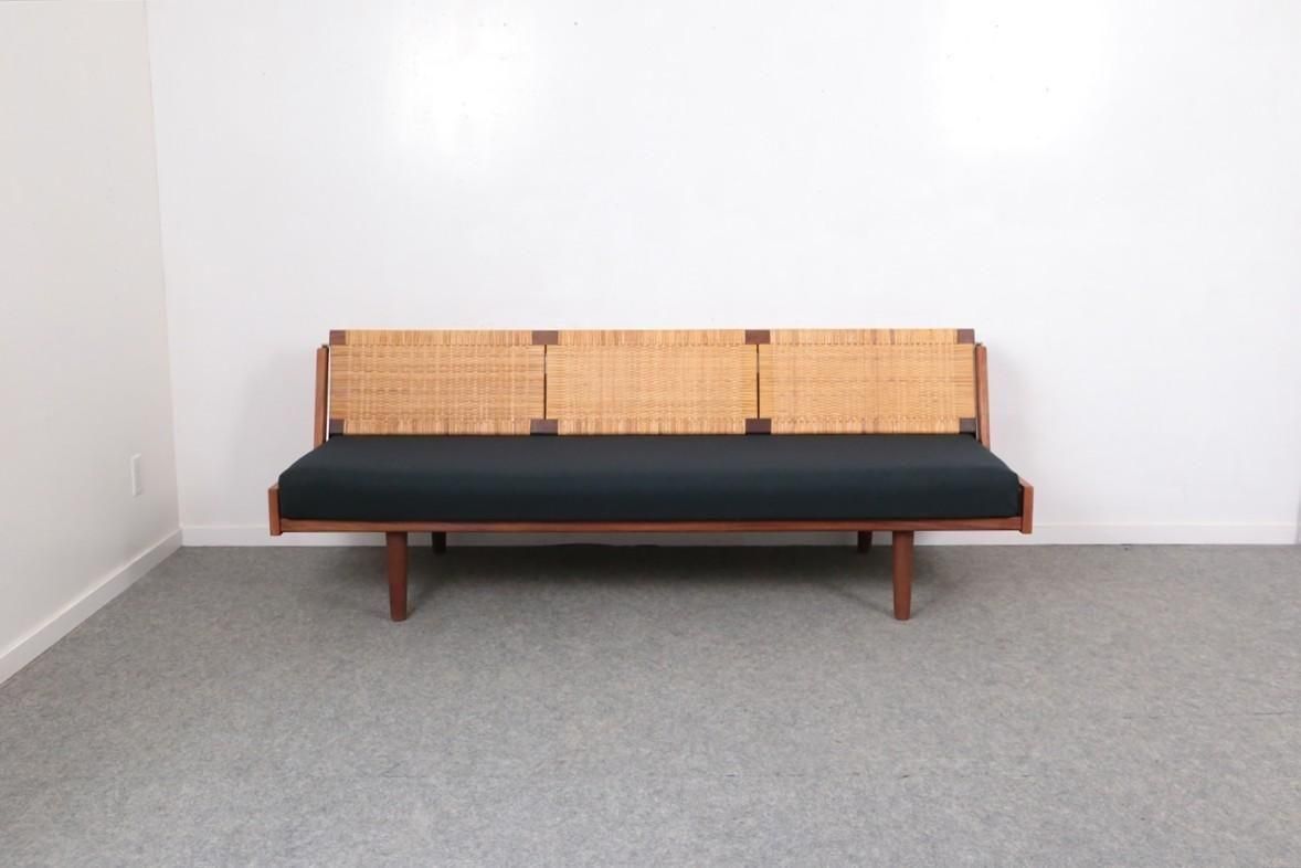 Hans J Wegner(ハンスJウェグナー)のデイベッド「GE258」です。こちらはラタンの背もたれのショートタイプです。背もたれのレールも金属製で、初期に製造されていた入荷が少ない製品です。GETAMAの刻印も入っています。 通常はソファとして、背もたれを上にスライドさせ持ち上げるとベッドとして使用できます。 来客用のベッドや、お昼寝などにもいいですね。ゆったりとくつろげます。 ソファ時には背もたれ内部に枕やブランケットなどを収納することも出来ます。 座面はファブリックブランドKvadrat(クヴァドラ)のRemix2シリーズ/996(ウール90%・ナイロン10%)で張替えています。張りのある上質なウールの生地です。複数の色を依り合わせた糸が織りなす奥行のある美しい色合いをお楽しみいただけます。 画像のように木部やラタンに細かいキズや凹みが数か所あります。 また、背面に角材が付いていますが、こちらは壁にぴったりに付けると背もたれが最後まで上がらないため、壁に隙間を作るために後から取り付けられたようです。 その他の細かいキズなど多少使用感はありますが、全体的には良いコンディションです。